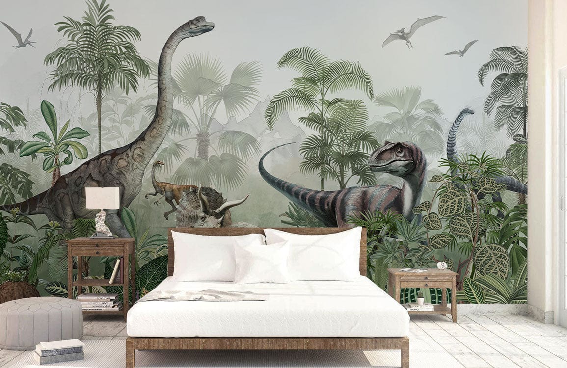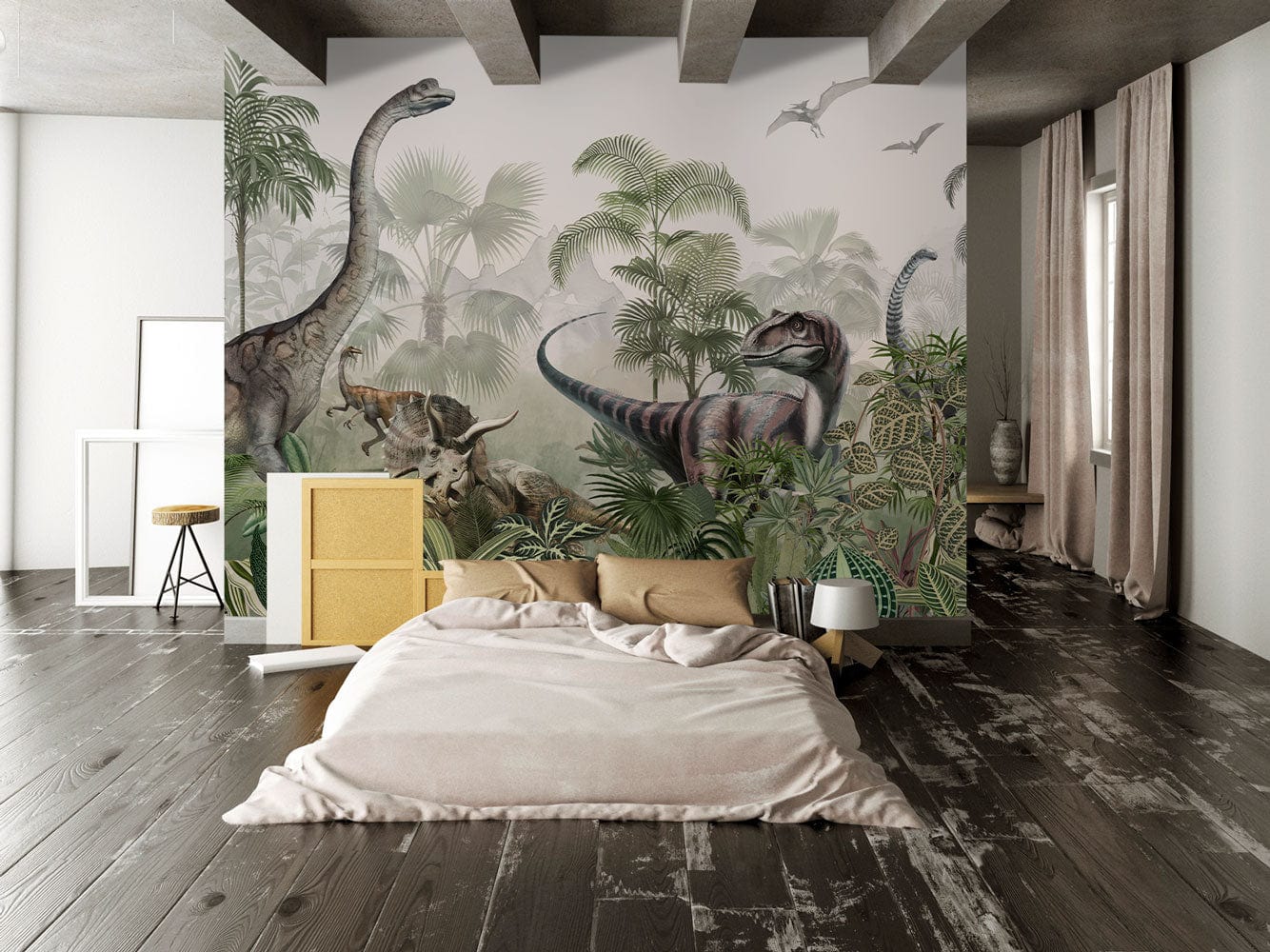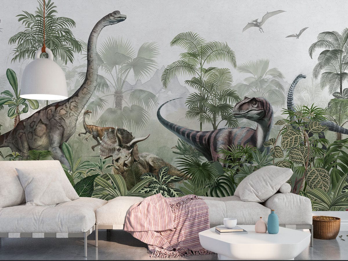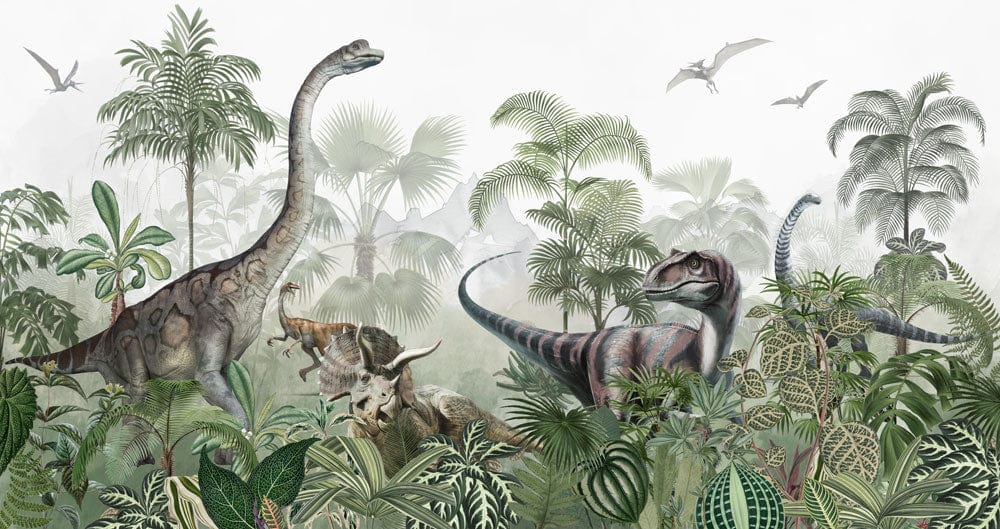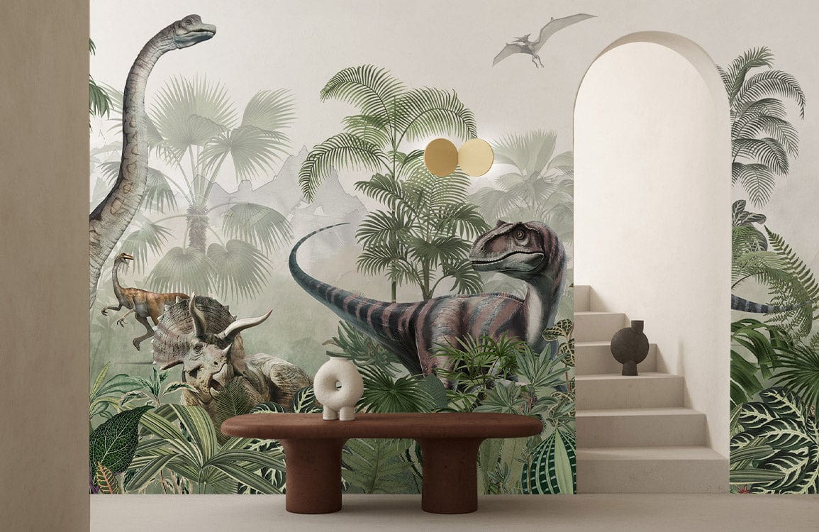 Immerse yourself in the captivating world of the Jurassic era with this exquisite mural wallpaper. The intricate design features a stunning array of prehistoric creatures amidst lush verdant foliage, creating an awe-inspiring natural panorama. The subtle interplay of greens and browns imbues the scene with a serene and timeless quality, perfect for adding a touch of sophistication to any room. This mural effortlessly complements a variety of interior styles, offering a glimpse into a lost world that captivates the imagination.