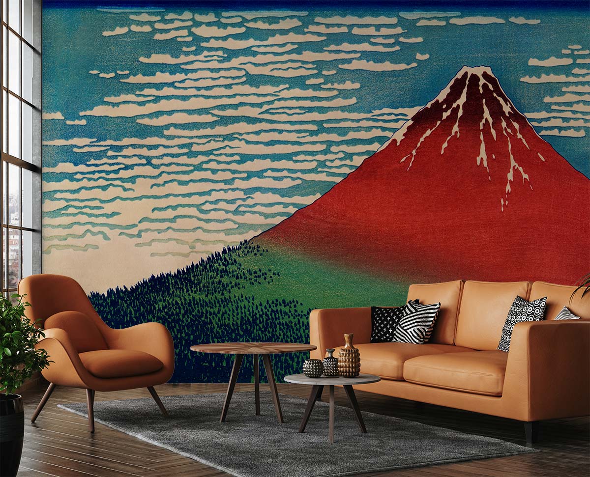 Invoke a sense of serenity with the Katsushika Hokusai Wallpaper Mural, featuring a harmonious blend of vivid colours and intricate details. The bold depiction of the iconic red mountain against a backdrop of soft, billowy clouds creates a mesmerizing focal point, ideal for any sophisticated setting. Its timeless artistry brings an element of classical Japanese elegance to modern interiors, making it a versatile choice for various decor styles.
