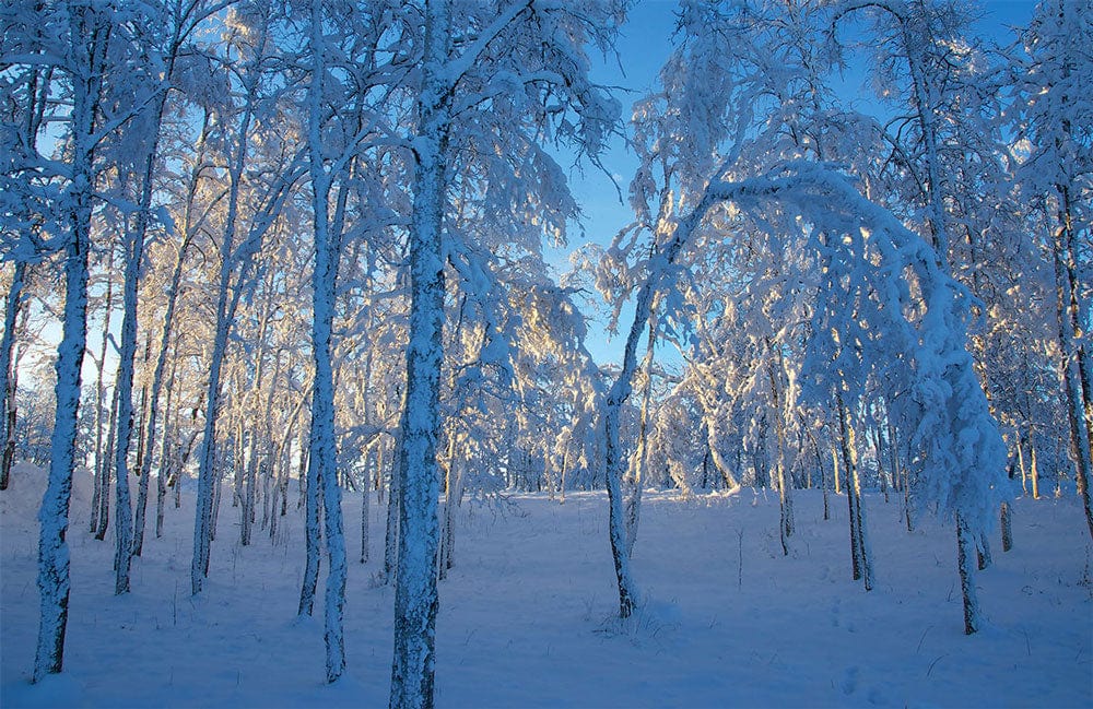 Experience the serene beauty of a crisp winter evening with the Kiruna before Sunset Wallpaper Mural. This exquisite design captures snow-laden birch trees bathed in the gentle glow of a setting sun, evoking a tranquil and contemplative atmosphere. Ideal for creating an immersive backdrop, its intricate details and textures evoke the silent whisper of the Nordic woods, making it a timeless addition to any interior space.