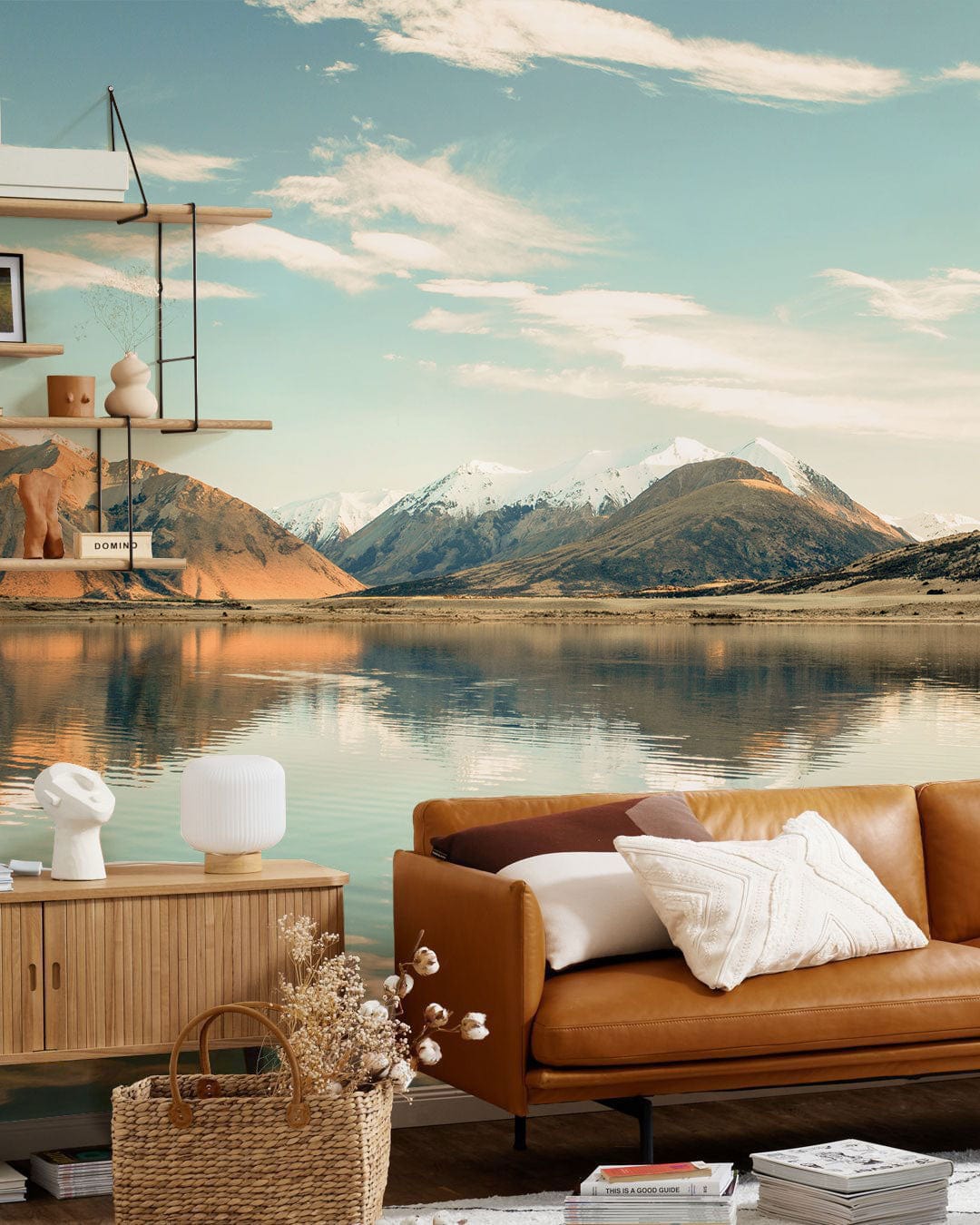 Immerse your space in the serene beauty of the Lake under Mountain Wallpaper Mural, featuring a breathtaking landscape where shimmering waters meet majestic mountains under a sky brushed with delicate clouds. This mural evokes a sense of calm and grandeur, perfect for interiors seeking a touch of the sublime. Its detailed artistry captures the quietude of nature, offering a sophisticated backdrop that suits diverse settings from the modern to the timeless.