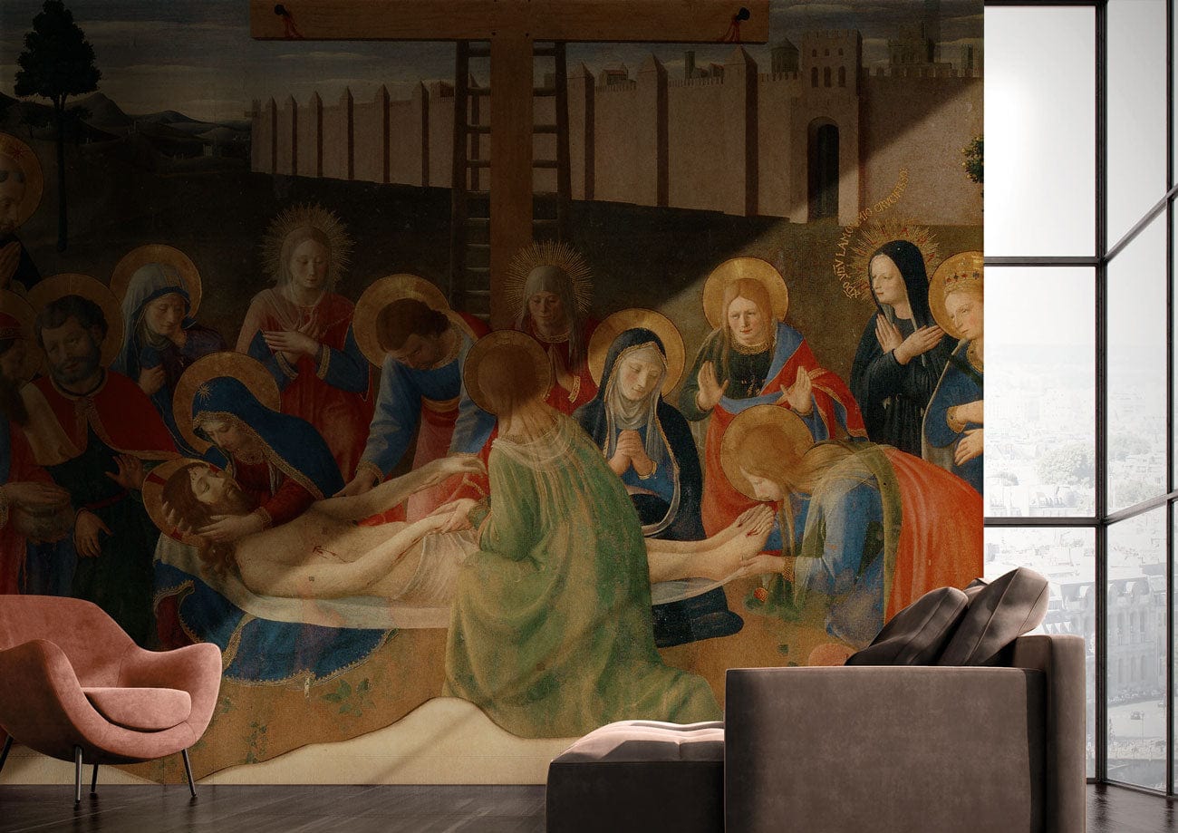 Immerse your living space in the rich tapestry of history and devotion with the Lamentation over Christ Wallpaper Mural. This beautifully detailed artwork captures a profound scene with a depth that invites contemplation. Skillful brushwork brings out the emotional resonance of the figures, while soft, harmonious hues blend seamlessly with any interior. The mural's timeless elegance is perfect for those seeking a touch of classical sophistication in their home or office.