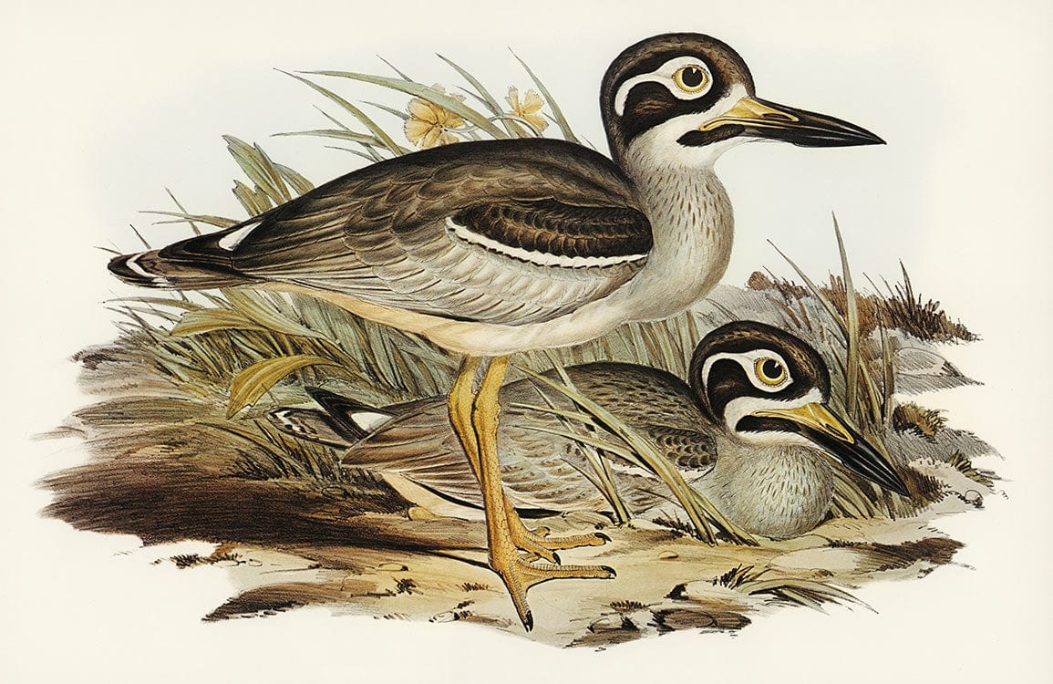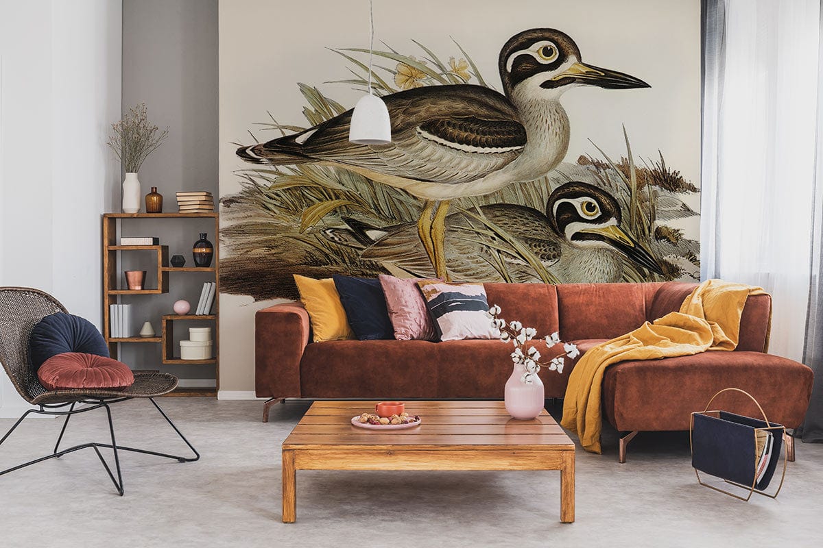 The Large Billed Plover Wallpaper Mural captures the delicate elegance of nature, showcasing two plovers nestled amidst gentle grasses and soft earth tones. With exquisitely detailed plumage and lifelike foliage, this mural encapsulates a sense of serene beauty, effortlessly complementing various interior styles with its timeless charm.