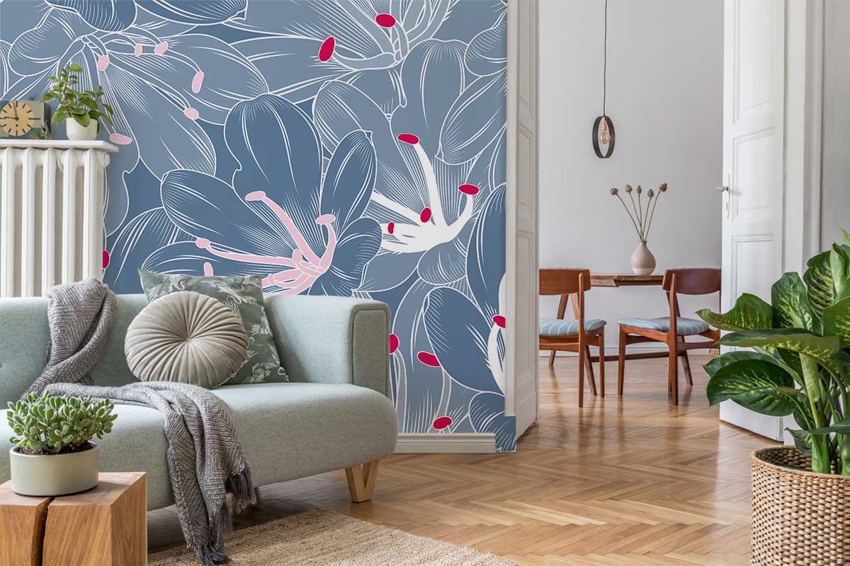 The Large Blue Flowers Wallpaper Mural presents an elegant tapestry of sweeping floral motifs, gracefully accentuated by delicate pink and bold red accents. This sophisticated design imparts a serene yet lively atmosphere, making it an exquisite backdrop for diverse interior décors. Ideal for crafting a statement wall, its refined artistry exudes a timeless charm, enveloping spaces with a luxurious yet understated allure.