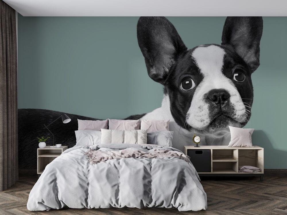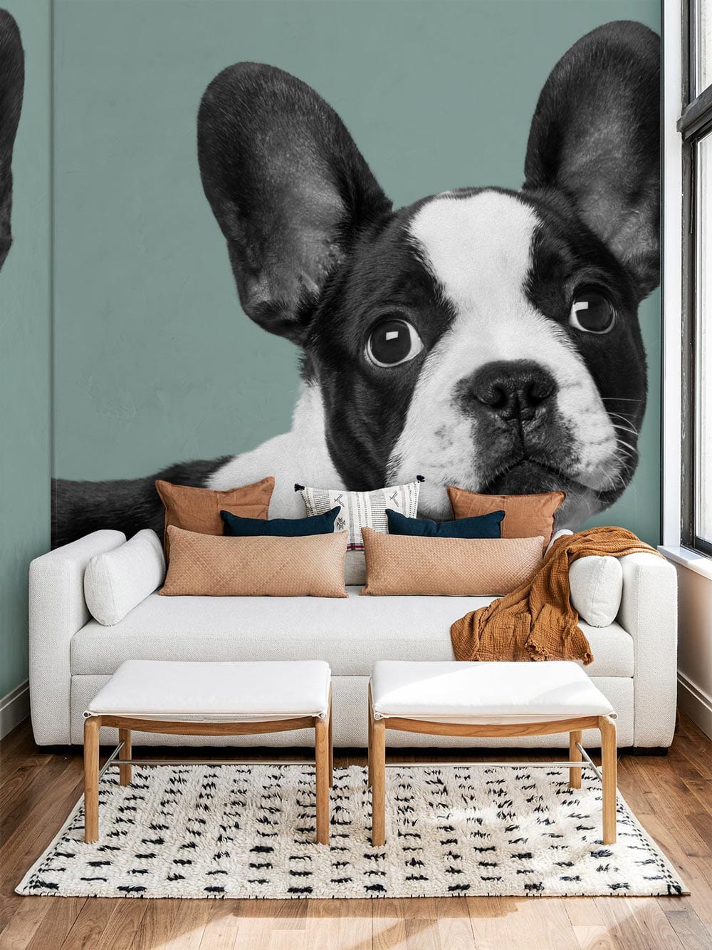 This Boston Bulldog Wallpaper Mural captures a playful yet sophisticated essence, featuring a charming black and white bulldog against a soothing sage background. Its detailed artistry and timeless charm make it a versatile choice for a variety of settings, providing a focal point that effortlessly blends with both modern and vintage interiors.