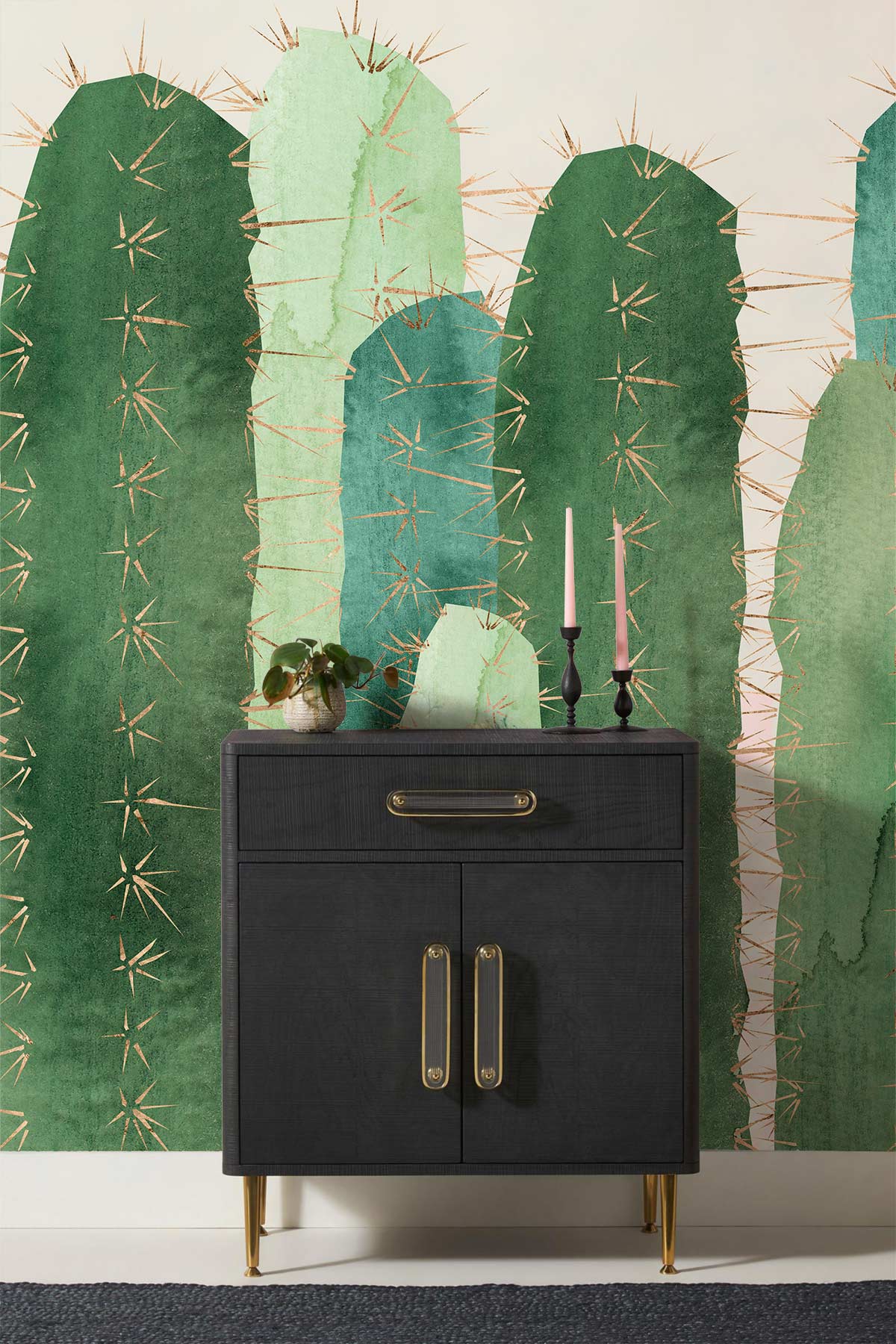 Immerse your space in the tranquil Desert Oasis Mural, where towering cacti, depicted in exquisite detail, evoke a serene and contemplative atmosphere. The lush shades of green bring to life the rich textures and natural allure of a sun-drenched desert, perfectly suited to both contemporary and classic interiors. Its strikingly elegant design invites a sense of openness and serenity, making it an ideal focal point for any setting.