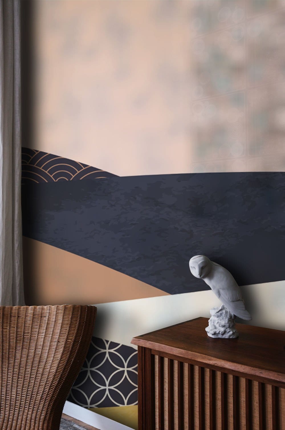 Immerse your space in the serene elegance of the Layered Waves Wallpaper Mural. This artistic design captures undulating waves with a sophisticated palette, harmonising soft pink, deep navy, and a warm mustard hue. The mural's intricate patterns and fluid forms create a captivating ambience, invoking a sense of timelessness that suits both modern and traditional interiors. Perfectly suited for living rooms, bedrooms, and stylish office spaces, it introduces a refined artistry that enriches any setting.