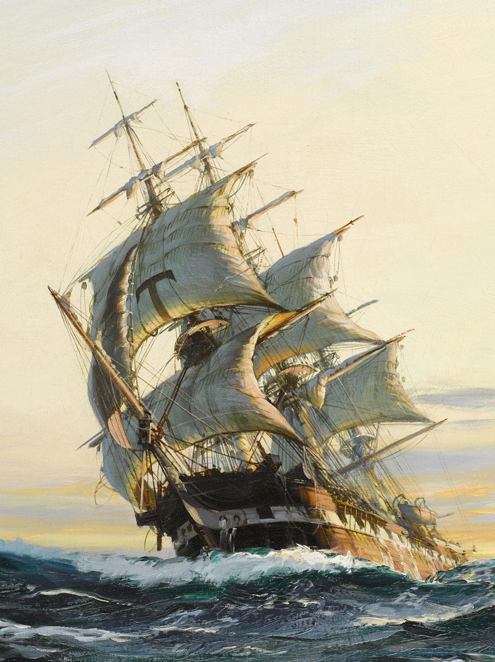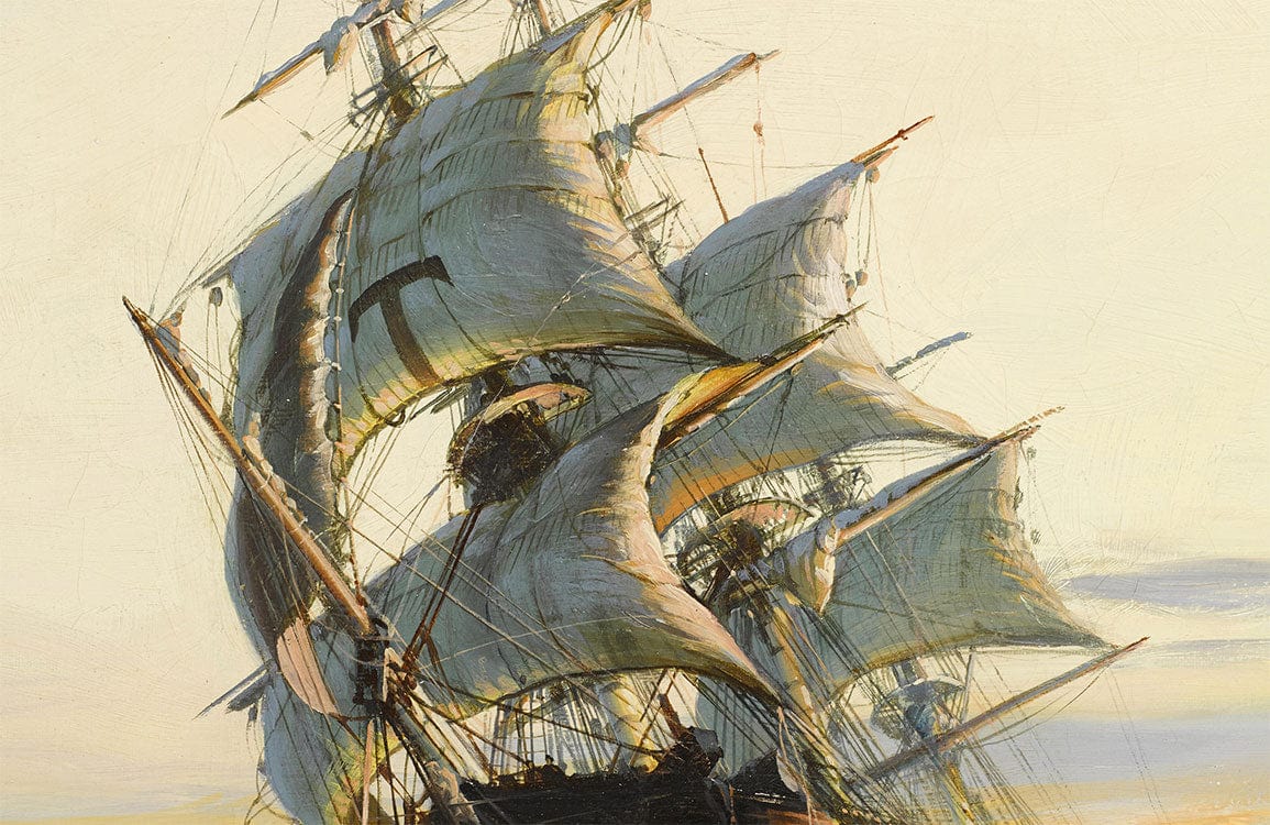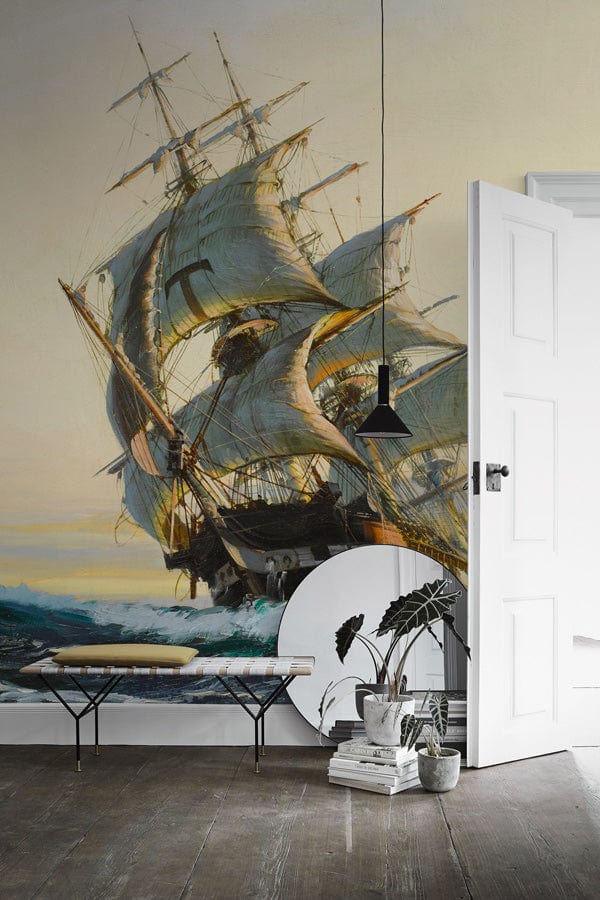 Immerse your space in the historical allure of the Leaning Boat Wallpaper Mural, featuring an intricately detailed depiction of a majestic sailing ship. The graceful curves of the sails and the soft interplay of light create a sense of movement that evokes a timeless journey across the seas. This mural seamlessly integrates into various interiors, providing a sophisticated backdrop with its elegant artistry and nuanced textures.