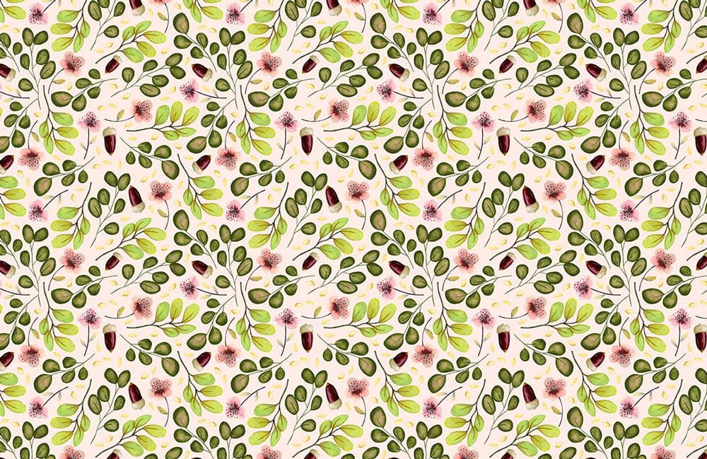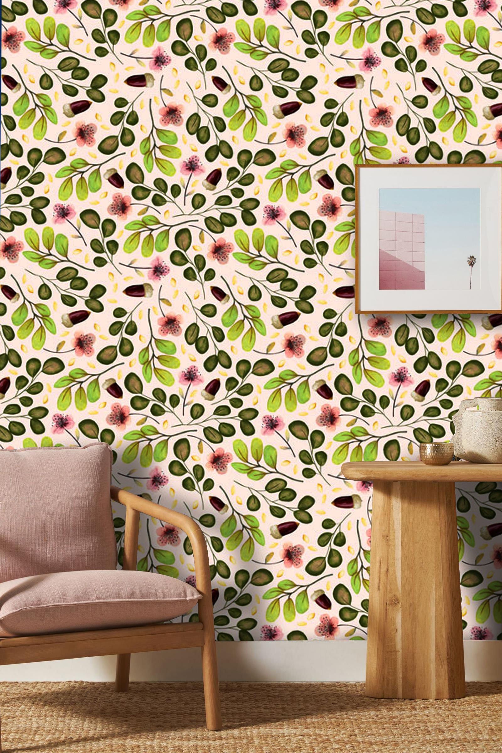 Create a gorgeous space with our leaf and flower wallpaper mural. This wall mural is designed with repeated pattern of small leaves and flowers in pastel pink background, which will bring a vintage yet fresh look to your space. Perfect wallpaper that works well with all your bedroom, living room, kitchen and dining hall.
