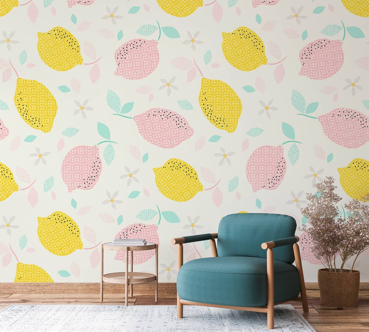 Spread the positivity and happiness allover your place with this colourful mural wallpaper of pinky and yellowish lemons. The wallpaper background with the white shade makes the design so light and bright. This design is a nice fit for a very chic and simple living room with colourful vibes. Also, the colours will make your place full of fun and energy so it is perfect for kids鈥?room with pinky curtains and fluffy off-white carpet.