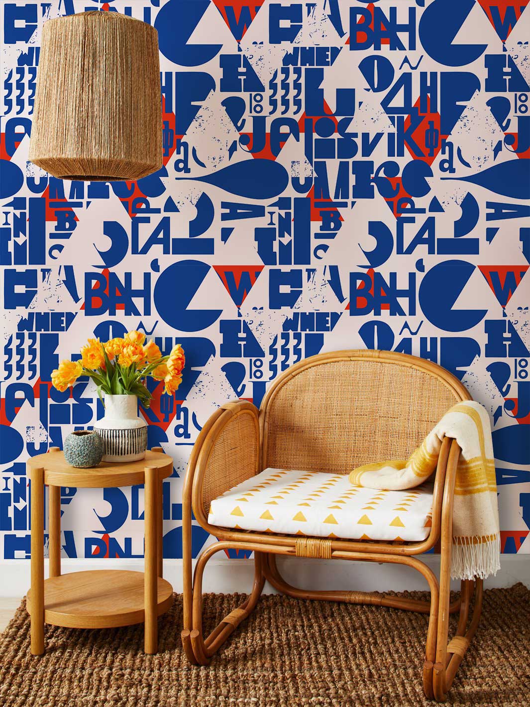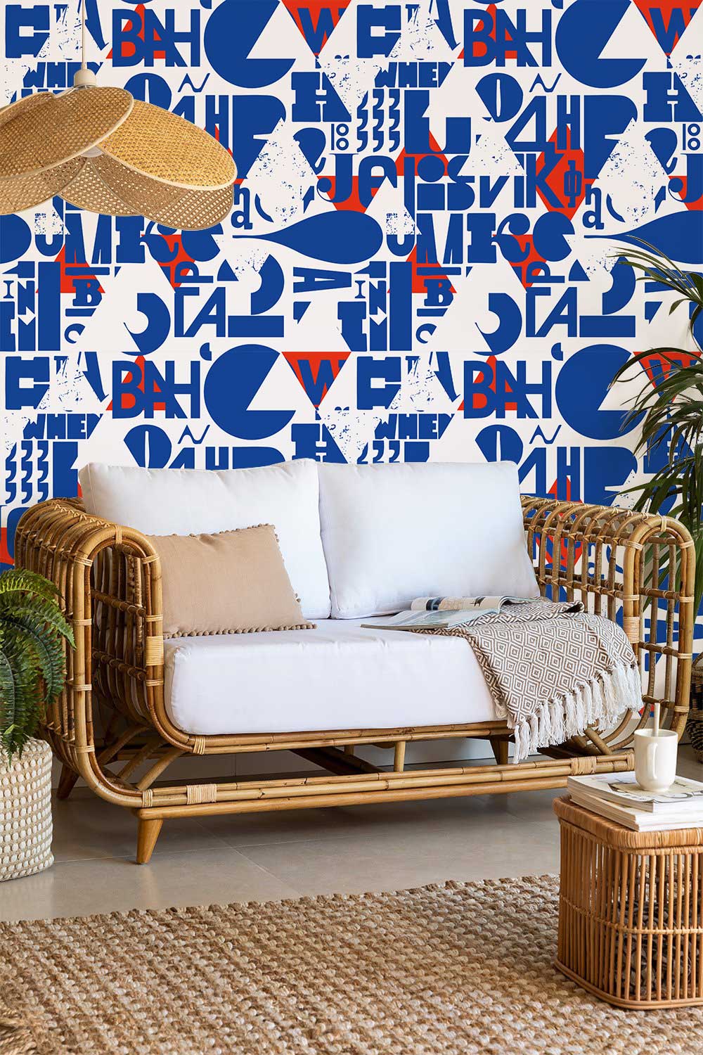 The Letter Age Wallpaper Mural captivates with its intricate typography and geometric patterns, creating a dynamic interplay of shapes and letters. The bold use of navy, white, and red gives it a striking presence, perfect for adding a sophisticated layer to any interior. Its unique artistic design exudes a vintage yet contemporary vibe, making it a versatile choice for spaces seeking a bold yet refined statement.