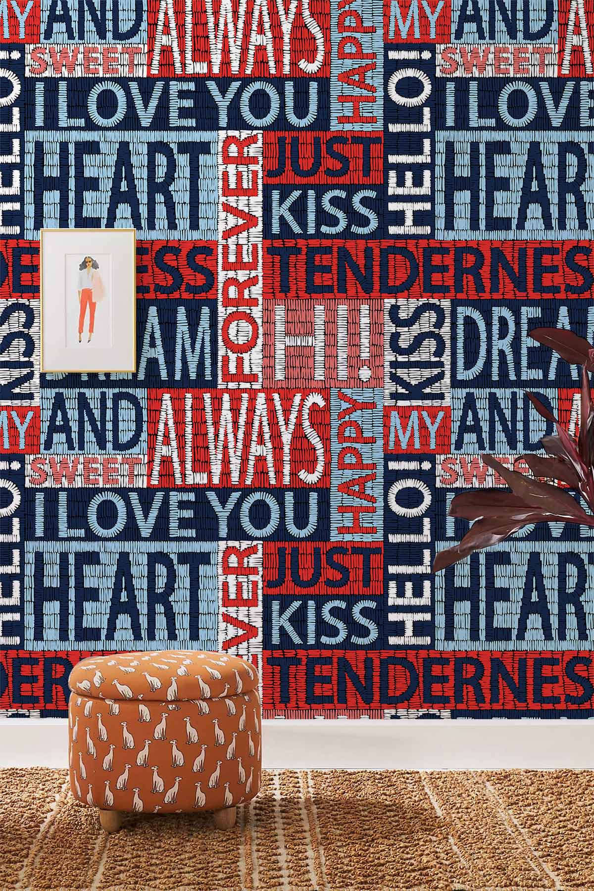 Dive into a world of heartfelt expression with the Letter Embroidery Wallpaper Mural. The intricately woven letters and phrases conjure a tapestry of emotion, artfully rendered in soothing shades of navy, red, and white. This mural offers a sophisticated touch, seamlessly blending into both contemporary and traditional settings. The textured appearance evokes a hand-crafted quality, bringing warmth and character to your walls.