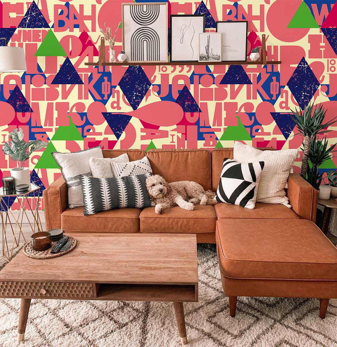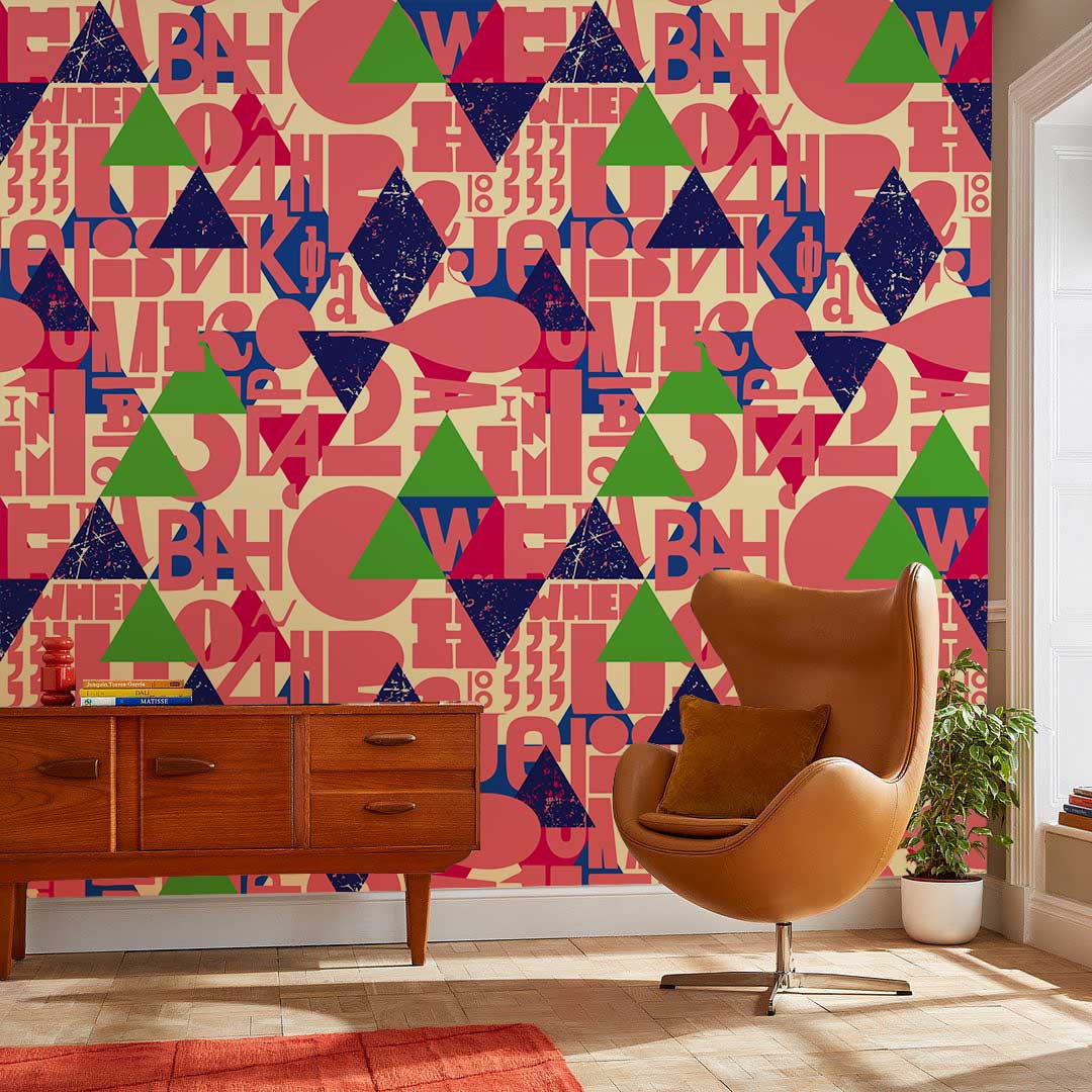 Dive into a mesmerising display with the Letter Show Wallpaper Mural, where bold geometric shapes dance in harmony with striking typography. Its vibrant palette offers a visually engaging backdrop, making an artistic statement on any wall. The juxtaposition of crisp letters against a tapestry of triangles and forms invites admiration, creating a dynamic yet balanced atmosphere that captures the eye. Ideal for those seeking to infuse their spaces with creativity and sophistication, this mural serves as an enduring testament to timeless design.