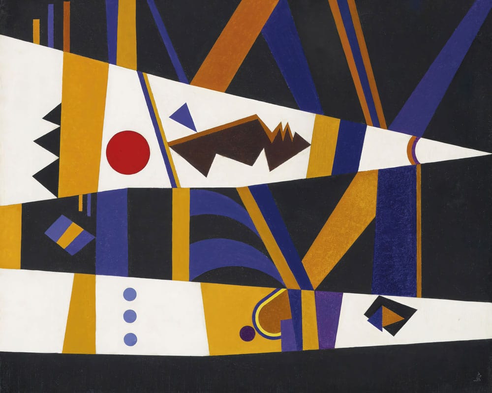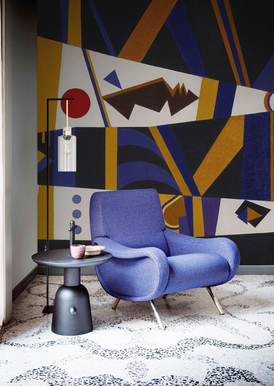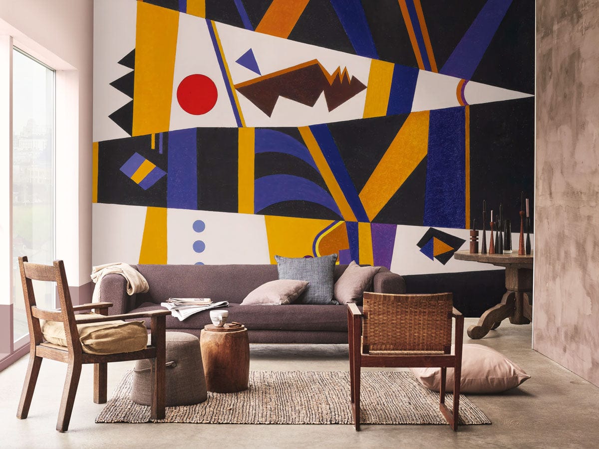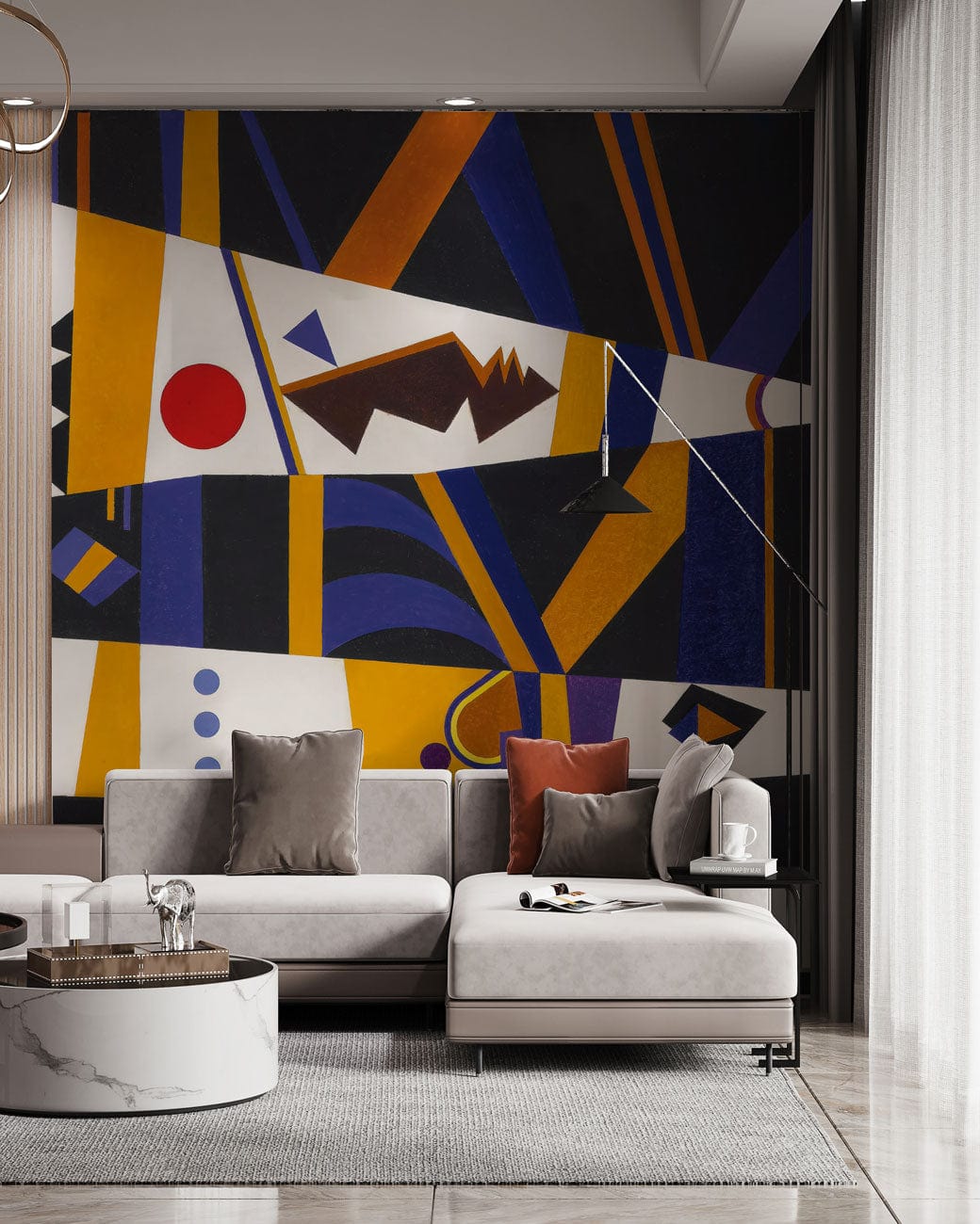 The Liaison Wallpaper Mural captivates with its geometric precision and striking colour palette. Layers of bold angular shapes in regal blue, deep golden ochre, and crisp white create a dynamic visual tableau. This sophisticated design effortlessly complements modern interiors yet draws upon artistic influences, making it versatile for diverse settings.