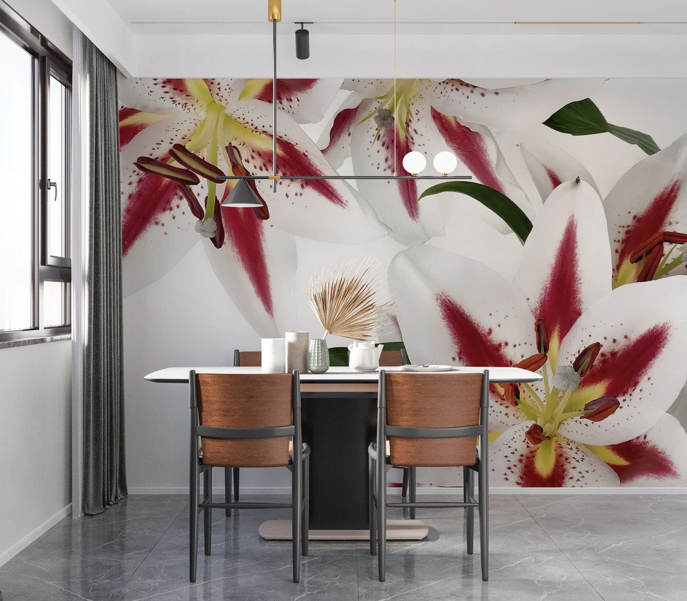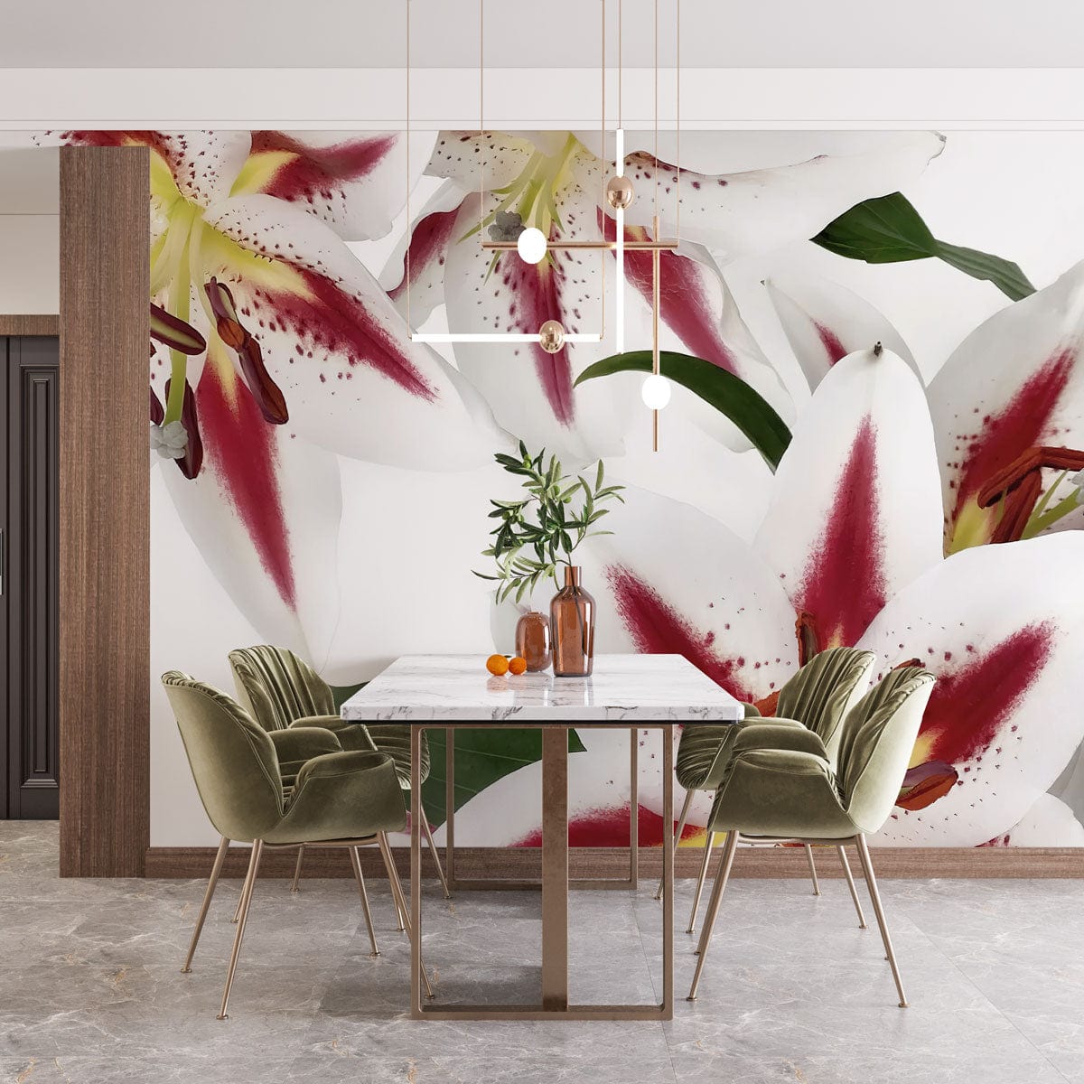 The Lily Aroma Wallpaper Mural presents a captivating array of elegant lilies, merging pristine whites with deep crimsons. Delicately detailed and gracefully blooming across its surface, this mural captures the purity and sophistication of nature, adding a timeless beauty to any room. Its exquisite interplay of colours and gentle curves offers a refined ambience suitable for a diverse range of interior styles.