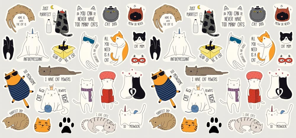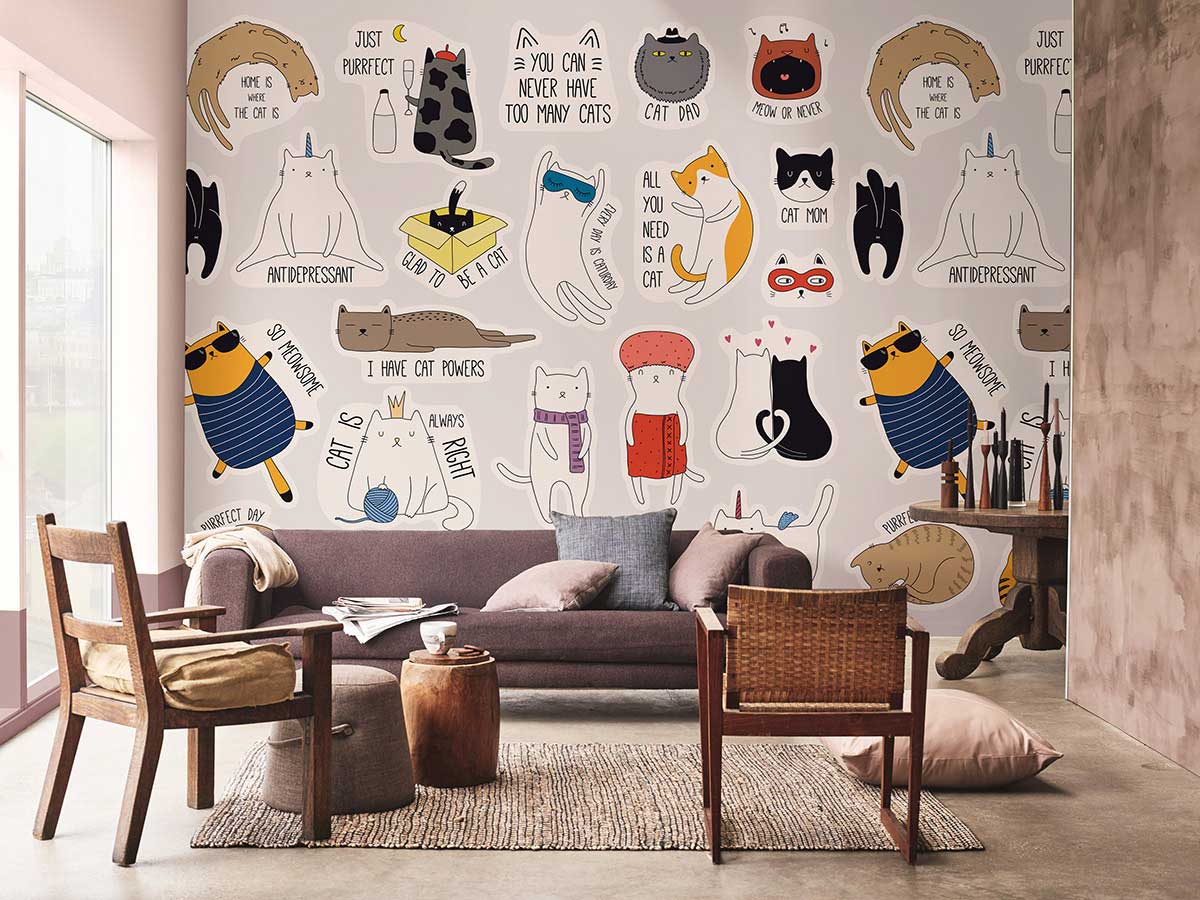 Immerse yourself in a whimsical world with the Liquid Cats Wallpaper Mural, where charming feline illustrations dance playfully across a light cream canvas. Each cat character brings its own personality through bold outlines and expressive poses, creating a delightful tapestry that celebrates cat companionship. This mural's artistic charm brings a light-hearted yet sophisticated touch that complements both contemporary and eclectic spaces, offering an inviting atmosphere that is effortlessly chic.
