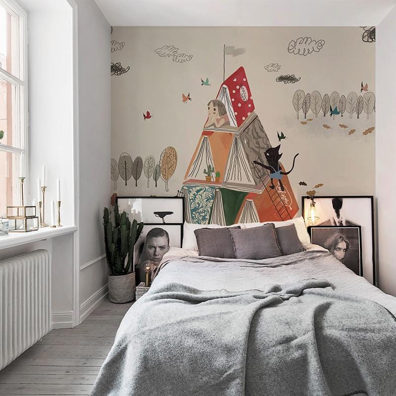 Immerse your space in whimsical storytelling with the Little Book Tent Wallpaper Mural. This captivating design features charming illustrations of a book tent adorned with a playful character and a curious cat, surrounded by a serene landscape of trees and scattered leaves. Soft, earthy hues create a calming atmosphere, making it an artistic backdrop that evokes both childhood wonder and refined elegance. Ideal for creating a subtle yet imaginative focal point, this mural effortlessly complements diverse interior styles.