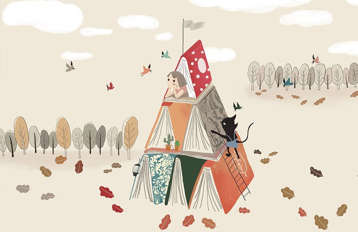 Open up your kids' imagination with this charming wallpaper mural. Watch the elements of fairy tales in this cutesy wall decal complete with a little girl chilling in a tenet made of books, Set in subtle pastel shades of beige, it is easy on the eyes and perfectly suitable for your kid's nursery room. Pair it with any bright colour or pastel furniture will be perfect.