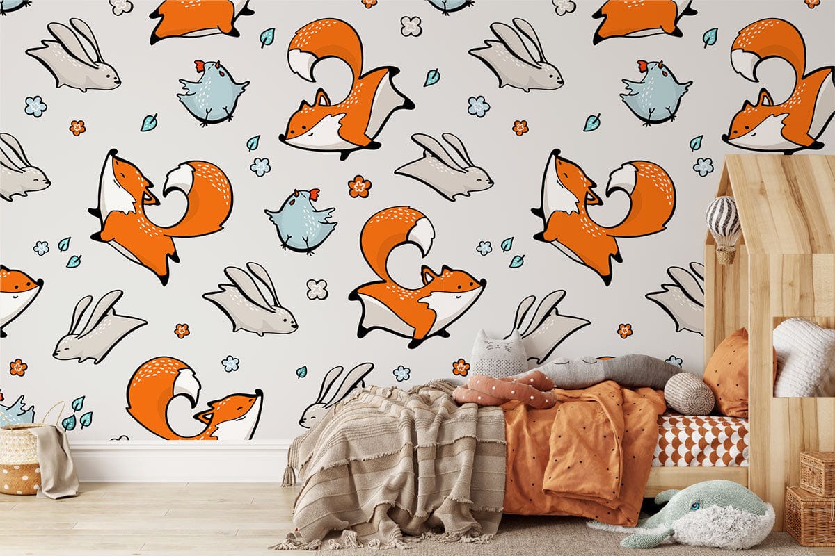 Feel the dynamicity and freedom with these naught little animals, in our mural design of playing foxes and rabbits with chickens the fun power of the mural wallpaper will design your kids鈥?room and make it full of energy and positivity. These funny little animals will make your kids happy about their room and will not feel bored about their surrounding area. Many kids don鈥檛 like to stay at their room or sleep. But this illustrative mural wallpaper will help you build for them a new imaginary world that will enhance their skills. Organize the room with black or white furniture and bed for more contrasted room.