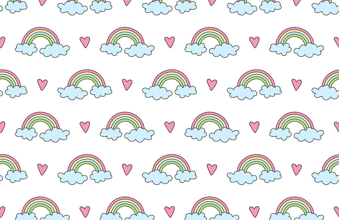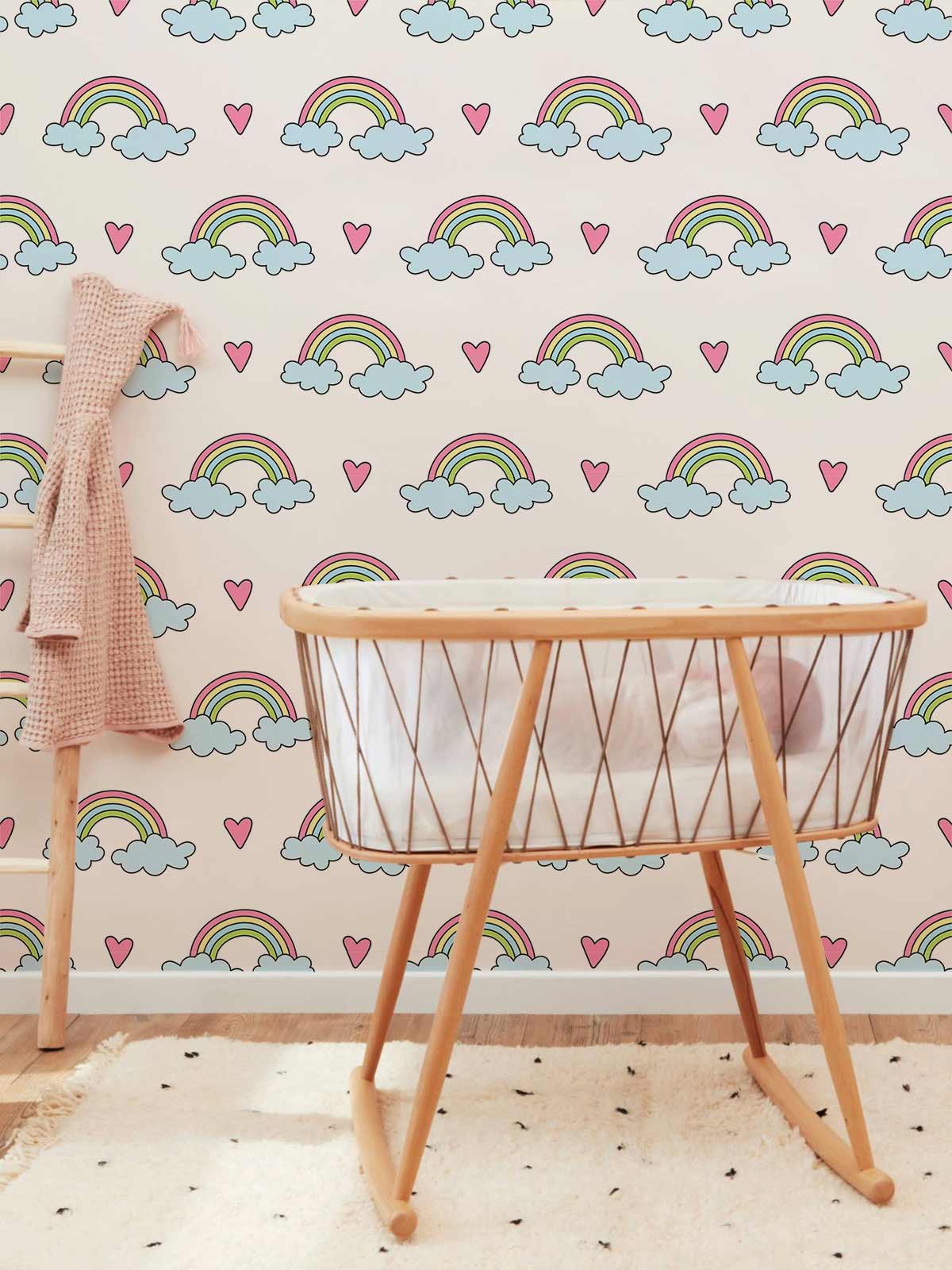 Elevate your space with the Little Rainbow Wallpaper Mural, featuring delicate pastel rainbows and whimsical clouds intermingled with playful hearts. This charming design seamlessly blends artistic flair with serene aesthetics, making it a versatile addition to any setting.