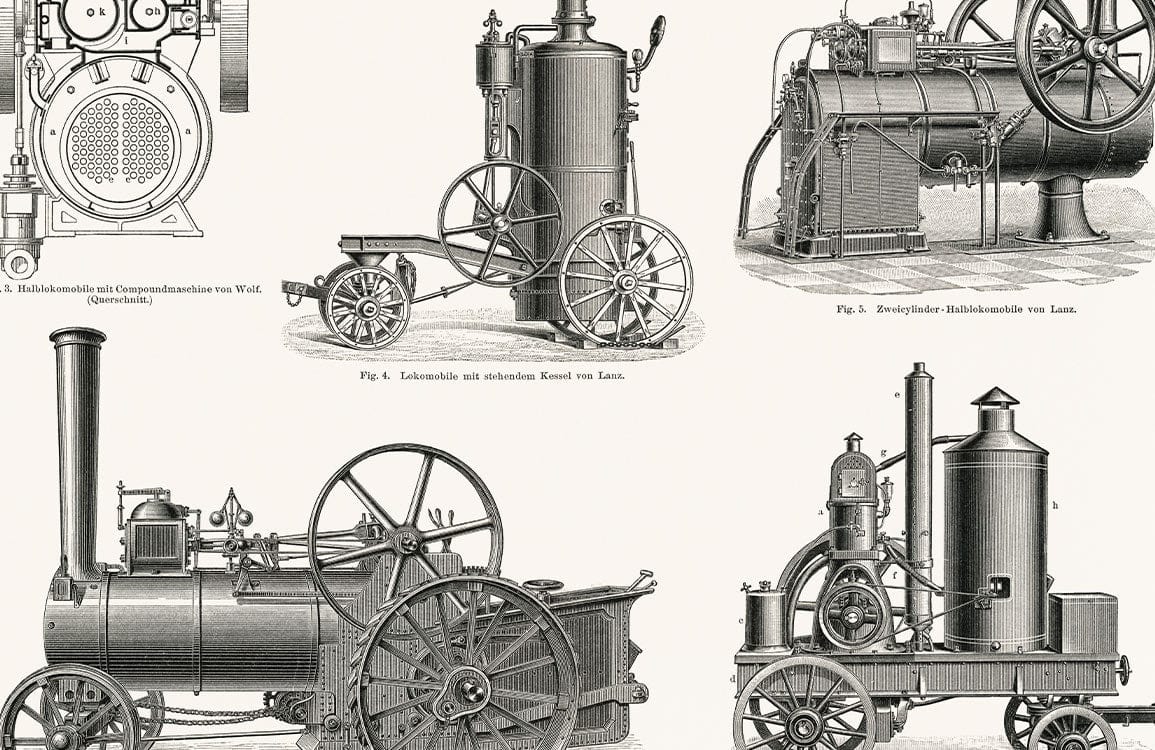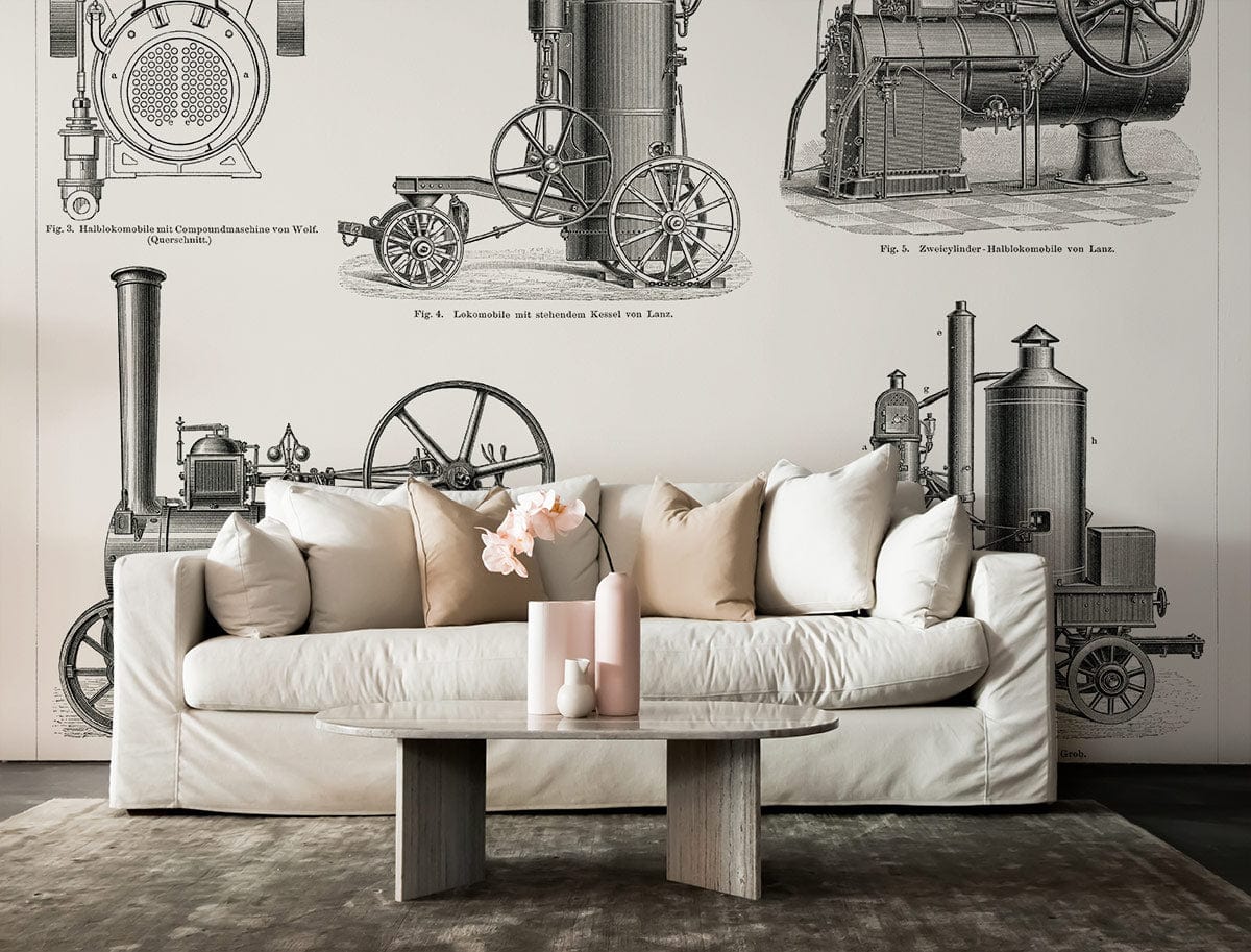 Lokomobilens Wallpaper Mural embodies a celebration of industrial design, featuring detailed illustrations of historical steam engines. The intricate line work and muted palette evoke a sense of vintage sophistication, perfect for enriching any space with historical charm and artistic flair. Ideal for creating a statement wall, its timeless appeal suits both contemporary and classic interiors.