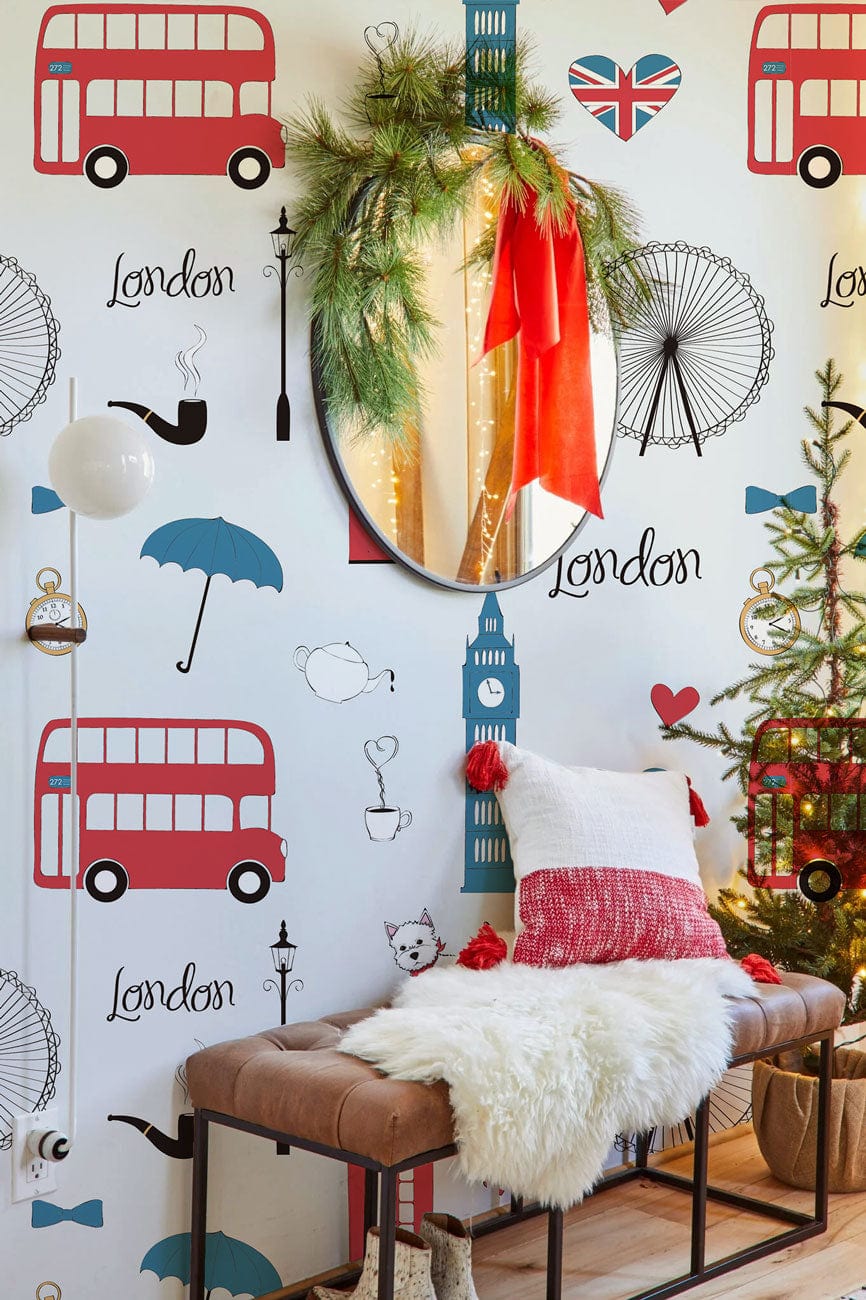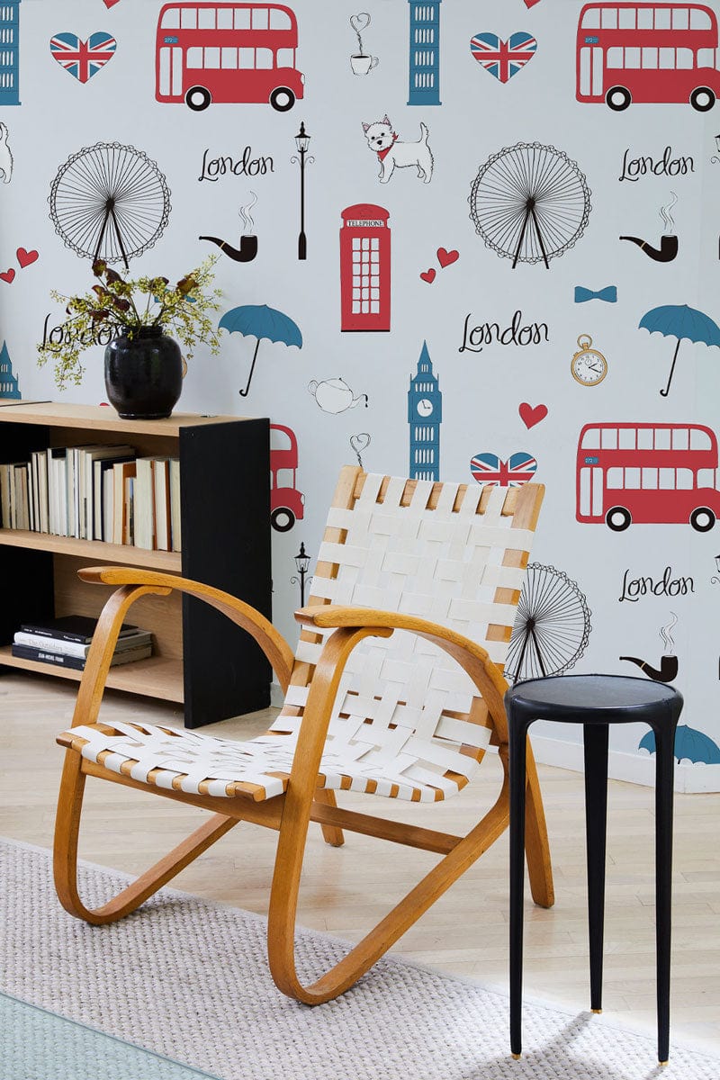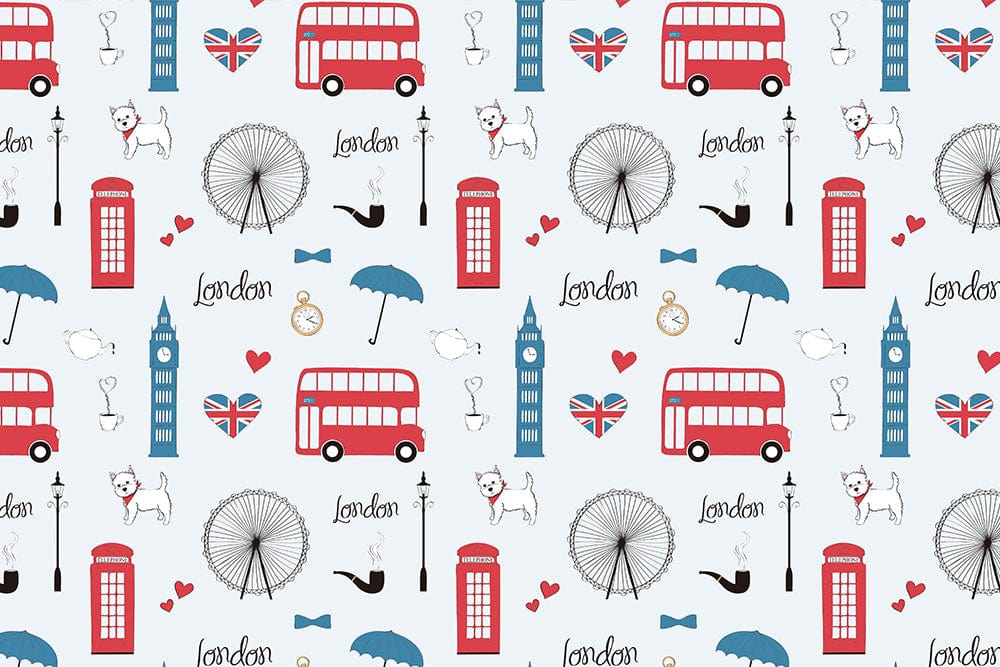 Discover the charm of London with this delightful wallpaper mural, featuring iconic symbols like red buses and Big Ben. Its whimsical illustrations and crisp lines add a touch of urban elegance to any room, making it an ideal backdrop for both classic and contemporary interiors.