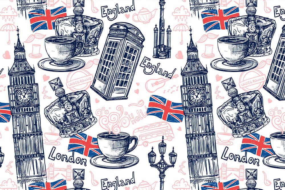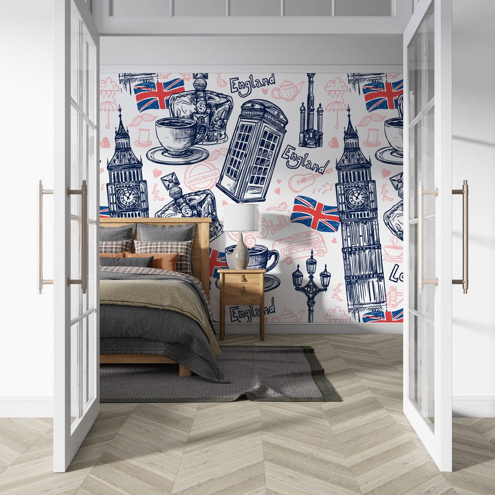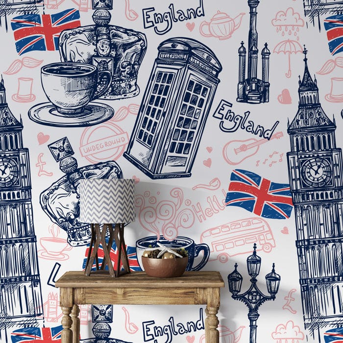 Capture the quintessential charm of England with the London Power Wallpaper Mural, showcasing iconic elements such as the Union Jack, Big Ben, and classic tea motifs. This design intertwines traditional British symbols with a sophisticated flair, creating an atmosphere of heritage and elegance suitable for any refined space.