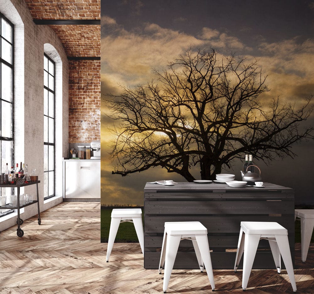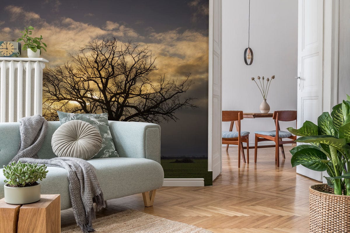 Embrace the serene beauty of nature with the Lonely Tree Wallpaper Mural, capturing the majestic silhouette of a lone tree against a dramatic sunset. This piece combines rich textures and a striking palette of golden yellows and deep blacks. Perfect for adding a touch of sophistication to any space, it invites contemplation and a timeless connection with the natural world.