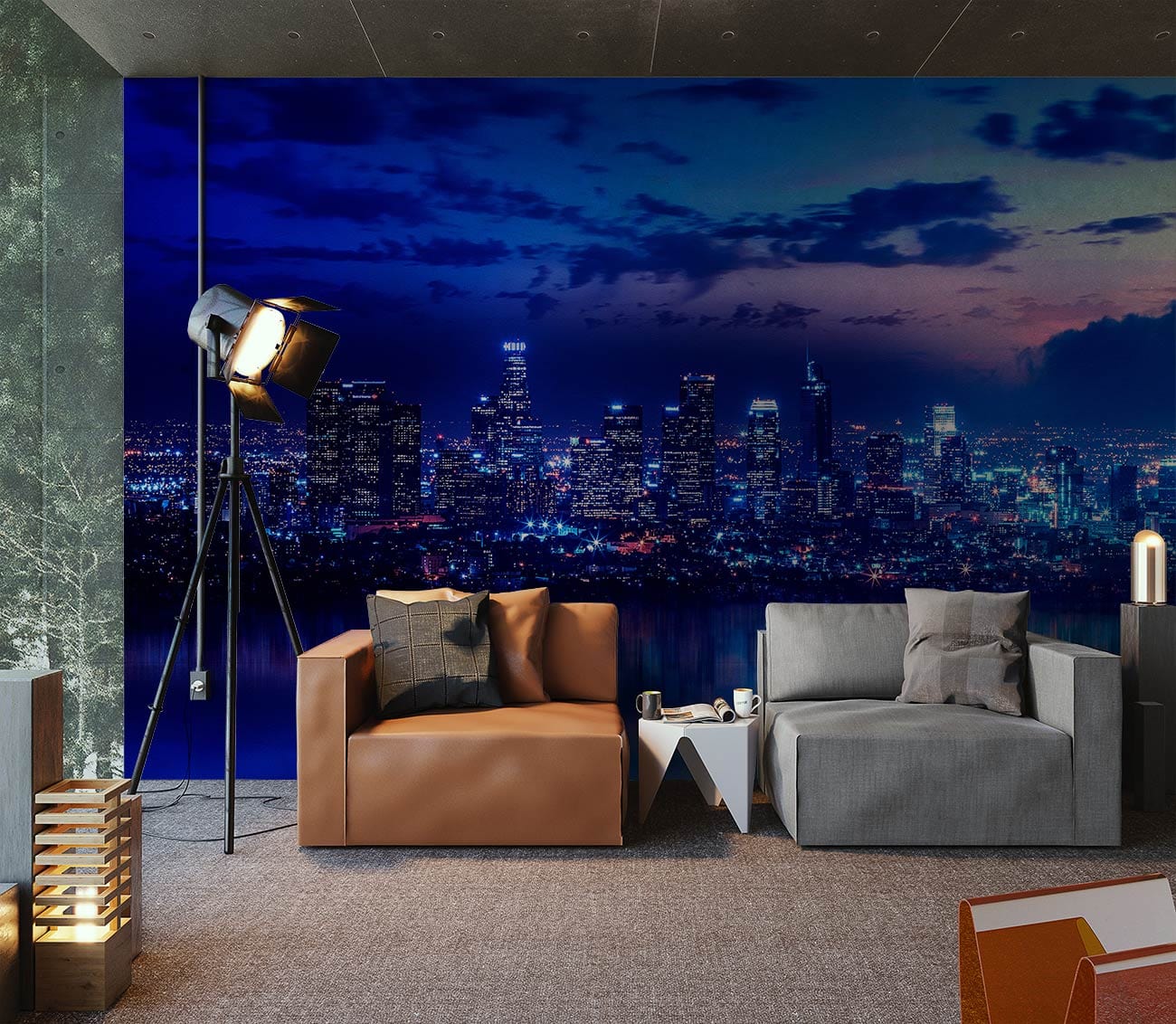 Immerse yourself in the breathtaking skyline of Los Angeles with this sophisticated wallpaper mural. The design captures the city's sparkling cityscape against a twilight sky, evoking a sense of modern elegance and urban grandeur. Perfectly suited for diverse spaces, this mural imbues a room with the dynamic energy of city life, offering a serene yet cosmopolitan ambience.