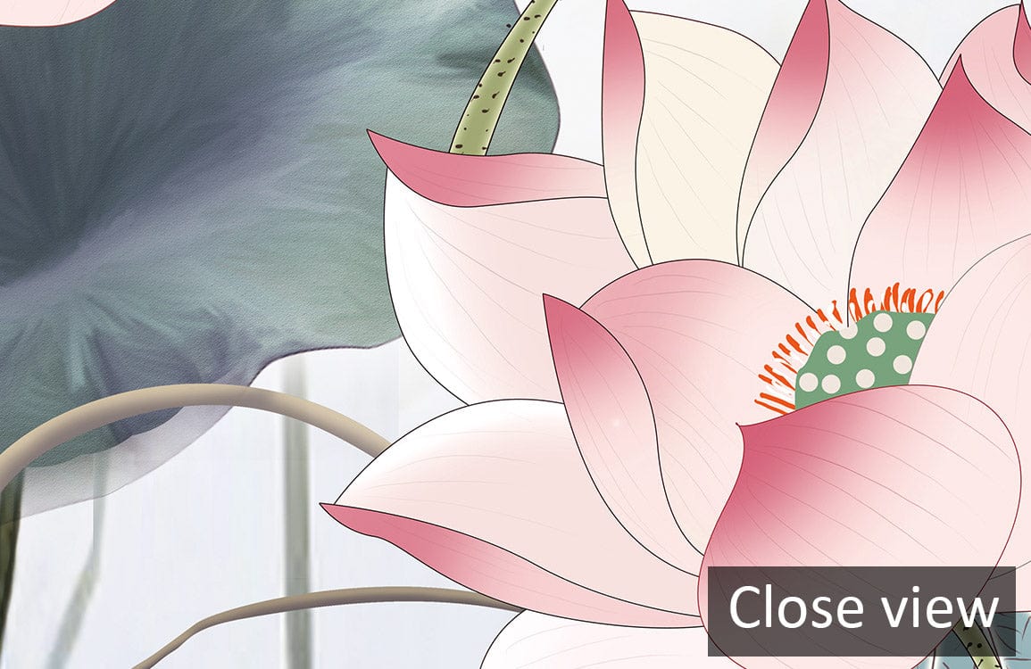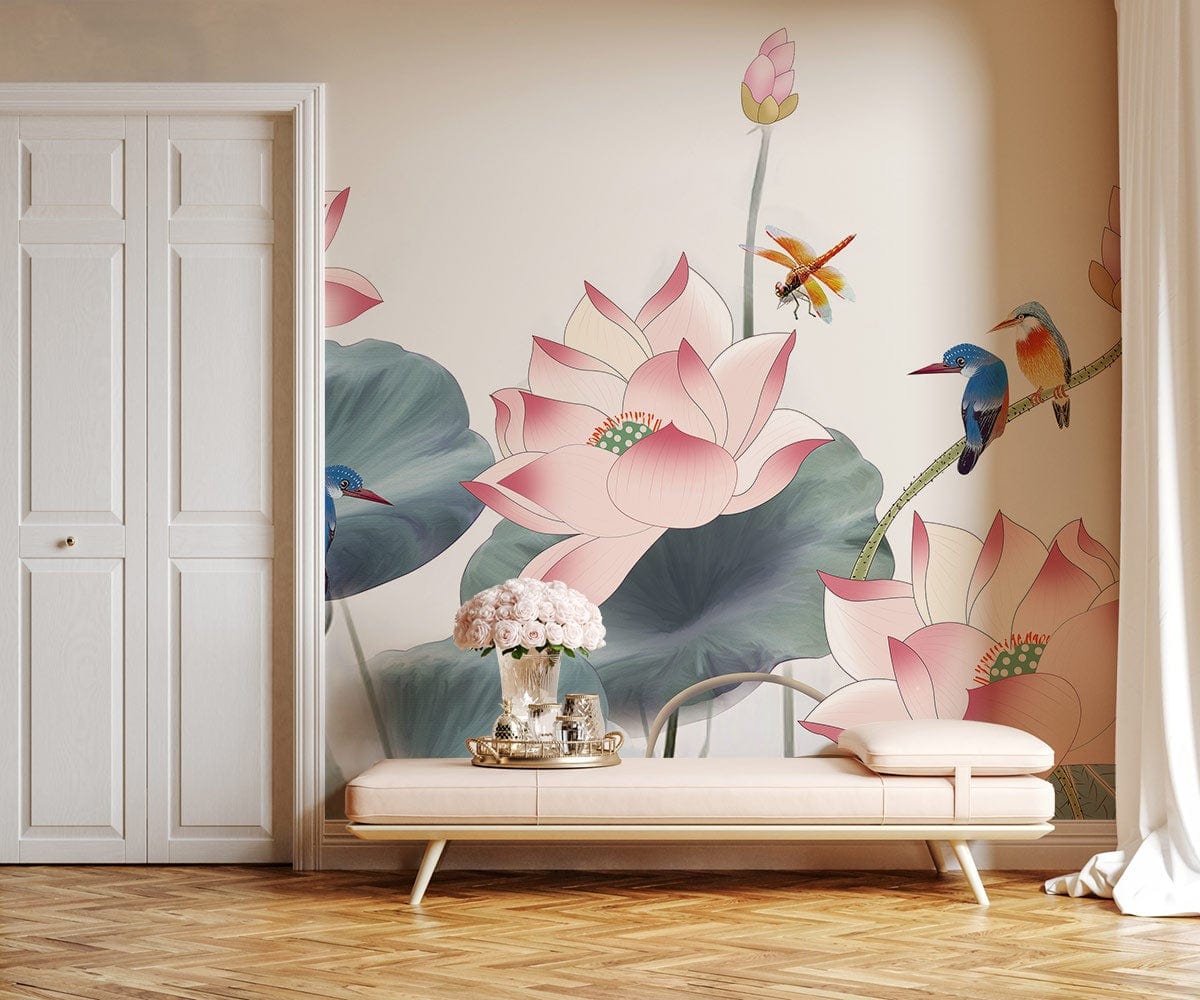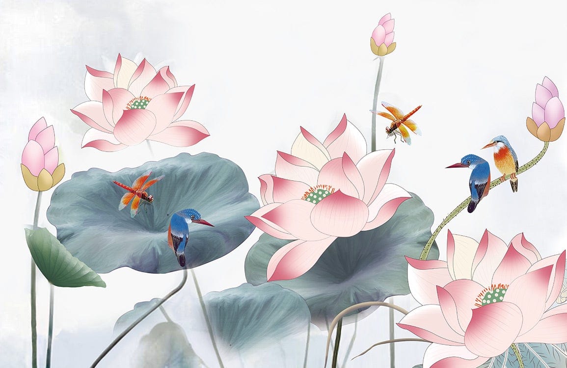 Immerse your space in the serene allure of our Lotus & Dragonfly Wallpaper Mural. Delicately painted lotus flowers blossom amidst a gentle interplay of dragonflies and kingfishers, evoking a tranquil water garden atmosphere. The subtle textures and fluid lines bring a touch of refined elegance to any interior, creating a sophisticated ambiance that's perfect for eclectic or contemporary settings.