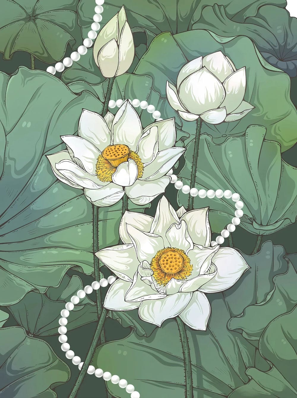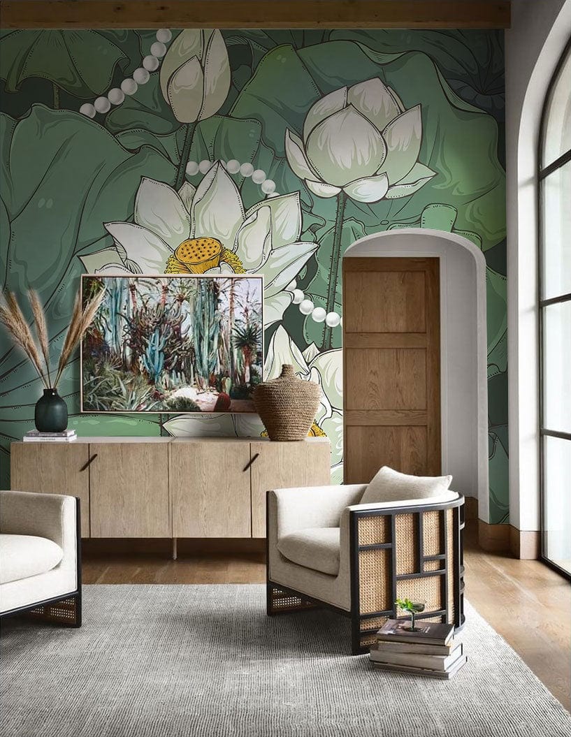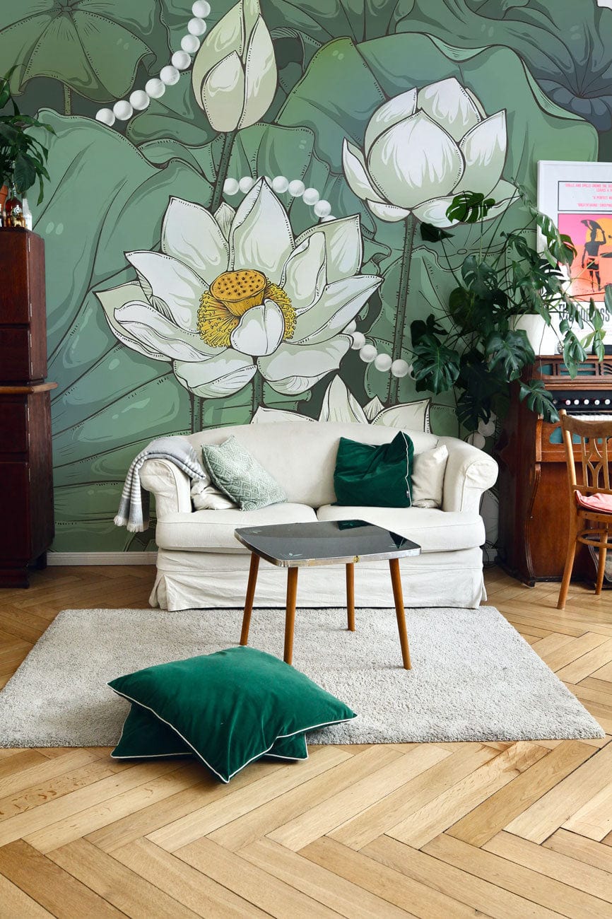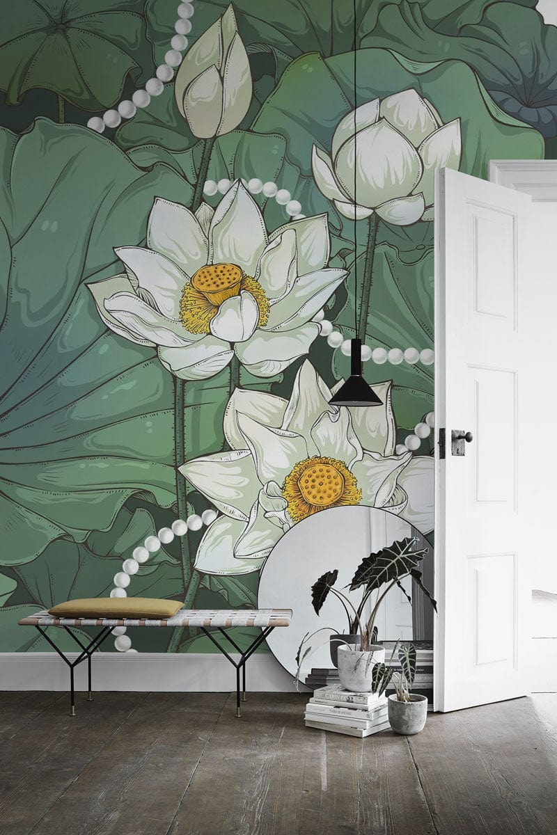 Immerse your space with the exquisite Lotus with Jewellery Wallpaper Mural, featuring delicate blooms intertwined with an elegant string of pearls. The intricate design and soft, natural tones create an atmosphere of tranquillity and sophistication, making it a perfect backdrop for any distinguished setting.