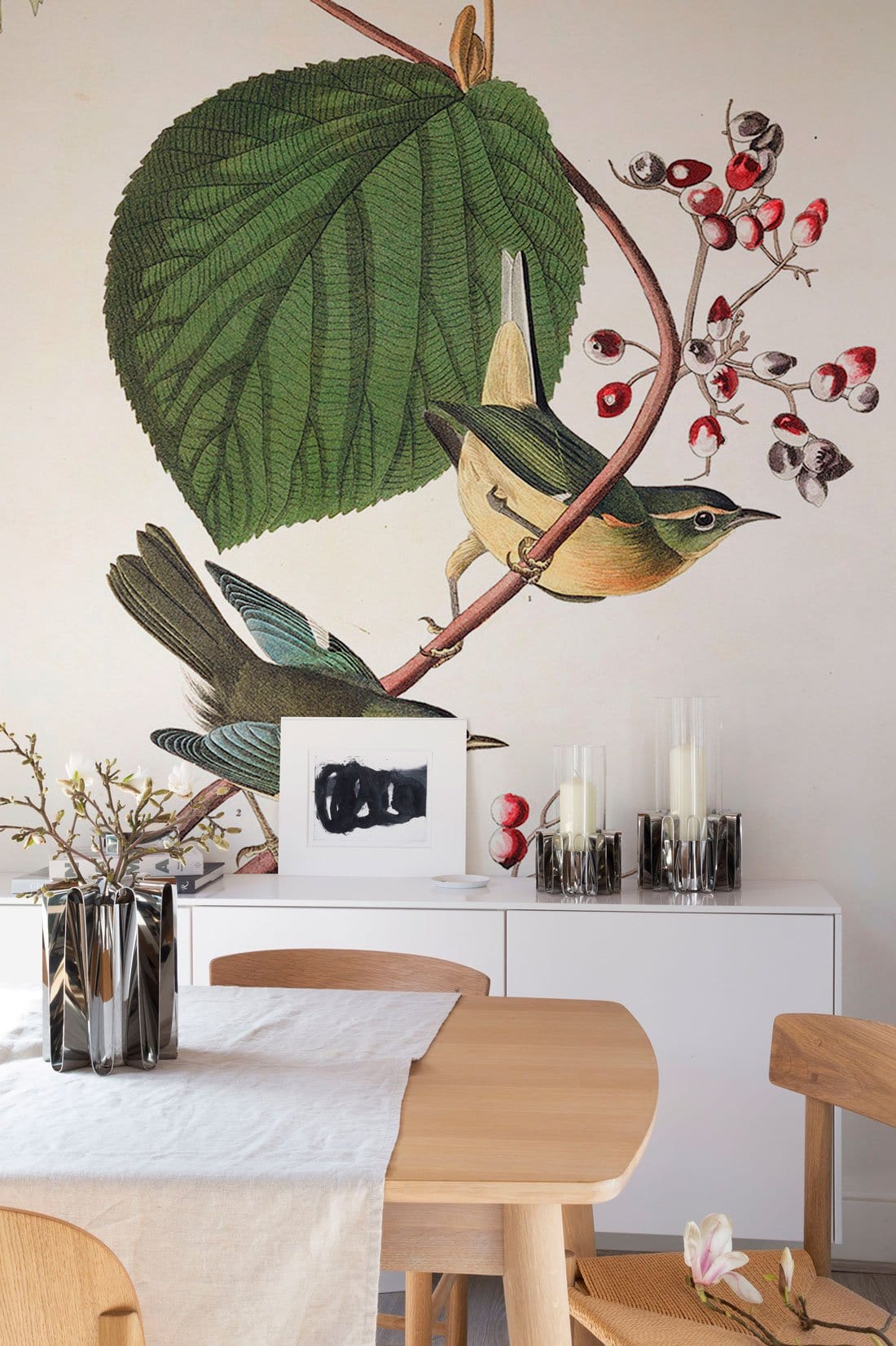 Immerse your space in the elegance of nature with the Lovely Birds Wallpaper Mural. Featuring exquisitely detailed illustrations of birds perched among lush leaves and delicate berries, this design offers a harmonious blend of artistry and serenity. The mural's refined composition and sophisticated palette make it a perfect addition to both classic and contemporary interiors.