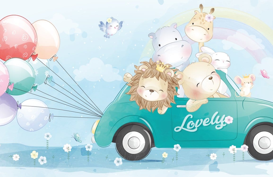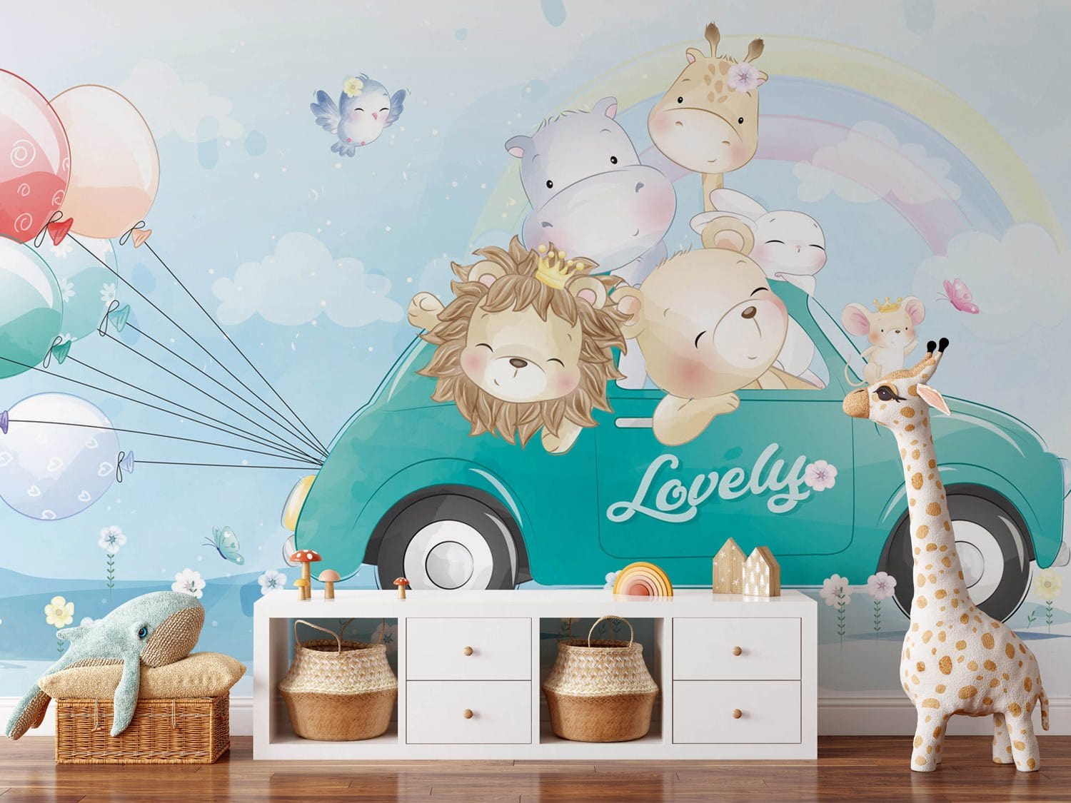 Who wants to take a drive with these cute animals? This beautiful, colourful painting of lovely car and animals will be perfect for the indoors in your child's bedroom, nursery room or playroom. Interesting rendering with a natural atmosphere and a refreshing wall decoration. Level up your interior designs with this stunning wall mural.