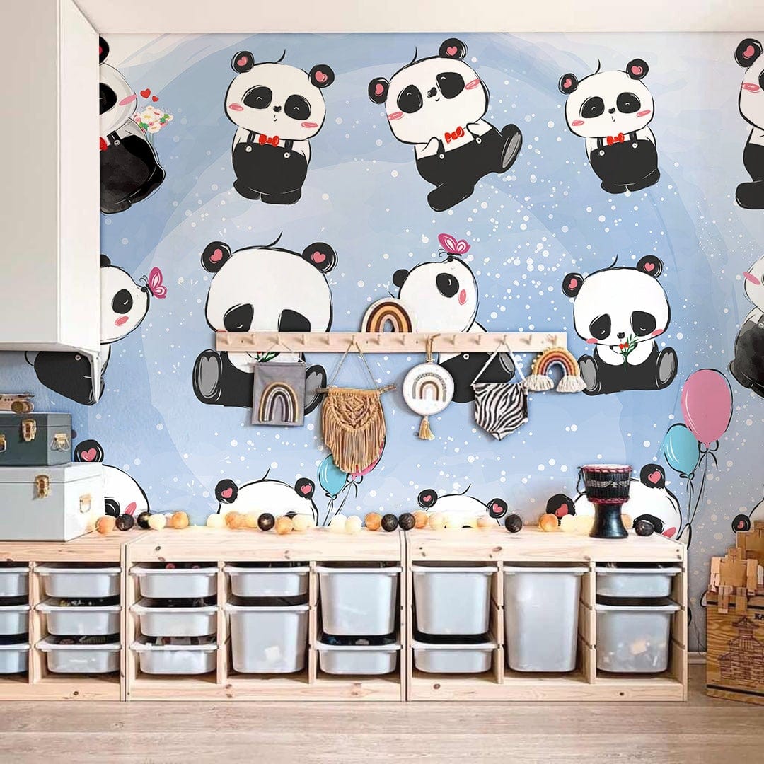If you are looking to renovate your kids鈥?room, we are here to help you with our new collection for kids will mural wallpaper that fit all tastes and will match all your needs. These lovely little pandas will spread happiness and love in your kids鈥?room. The blue shades at the back ground makes it unisex mural wallpaper so it fits both genders not just for boys/ this design can fit a nursery too very perfectly, and also kid鈥檚 area, and a playing room. You can use greyish carpets and curtains to make a contrast and let the design appear clearly.