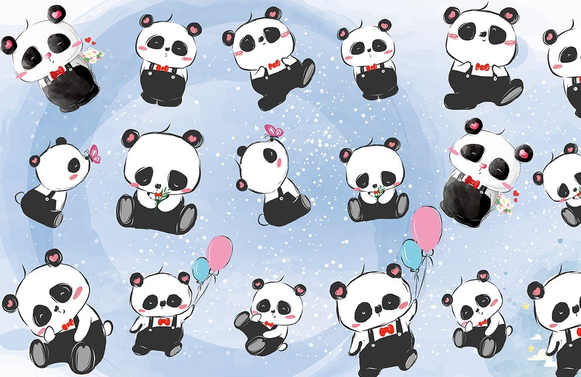Immerse your space in a whimsical charm with this Lovely Pandas Wallpaper Mural. Dancing across a serene, sky-blue background, playful pandas clad in delightful accessories create a captivating visual feast. Each panda, rendered with exquisite detail and a touch of whimsy, adds an endearing personality to your walls. Perfect for infusing a sense of warmth and joy, this mural suits a multitude of interiors, offering an ambiance both sophisticated and timeless.