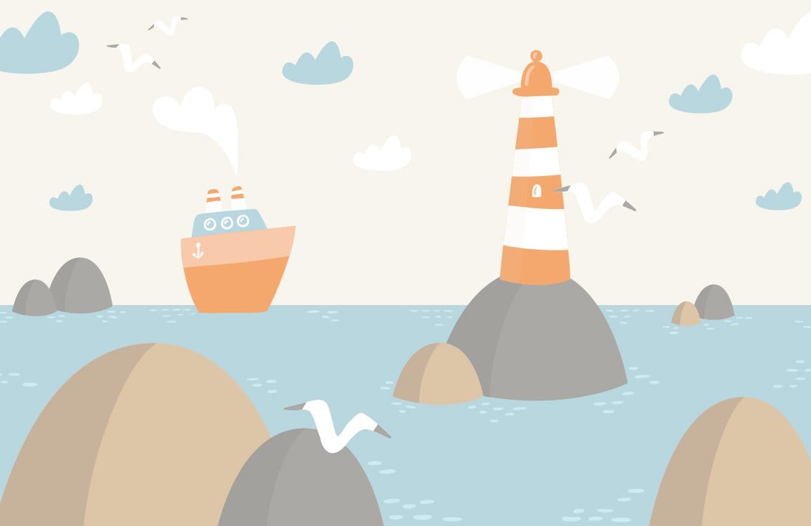 Immerse your space in the whimsical serenity of the Lovely Sea Wallpaper Mural. This artful depiction captures a playful yet sophisticated maritime scene with gentle waves and a charming lighthouse, creating a coastal sanctuary in any room. The soft, muted tones of seafoam, warm orange, and gentle greys evoke a calming coastal atmosphere, blending seamlessly with a range of interior aesthetics. Perfectly balancing artistry with tranquillity, it brings an inviting touch to both modern and classic decors.