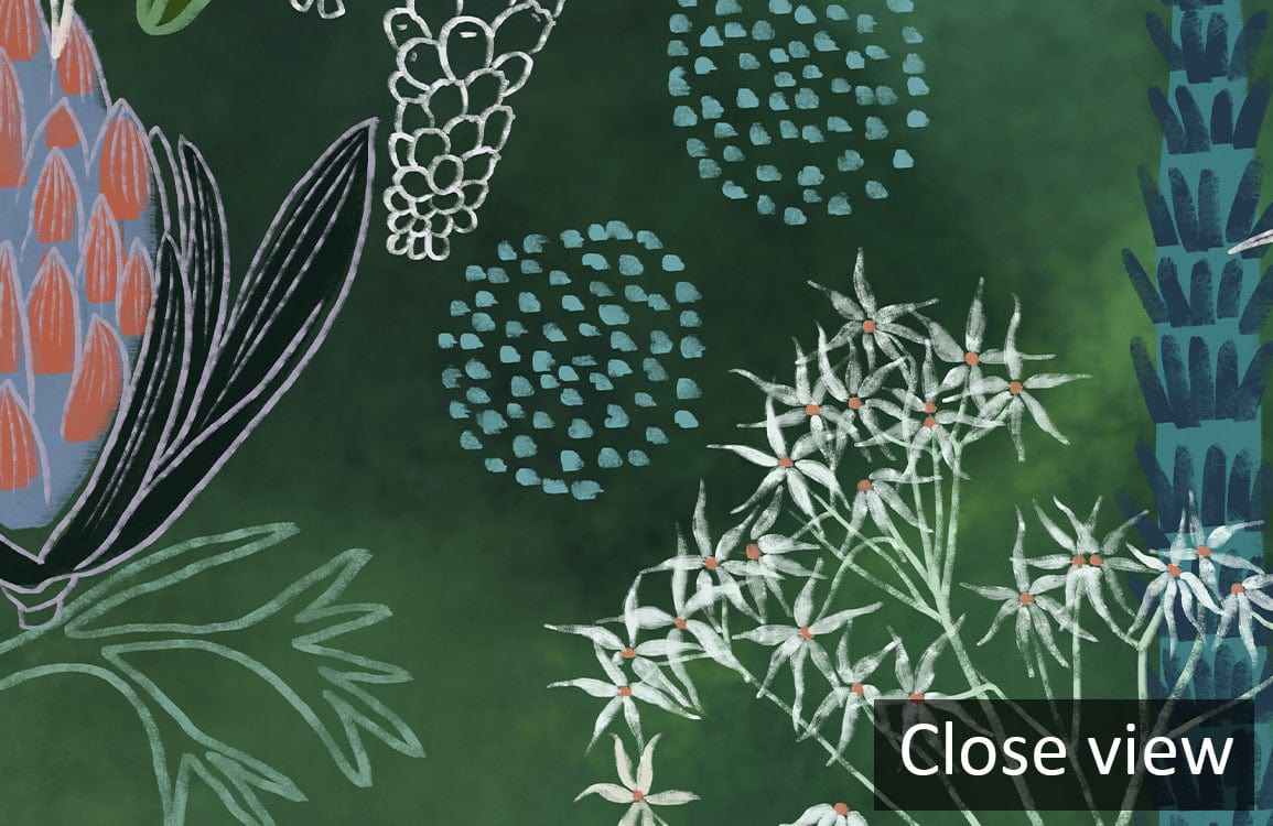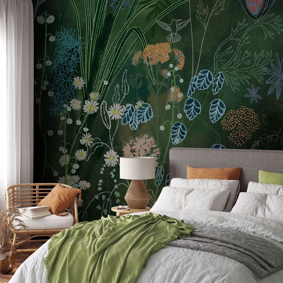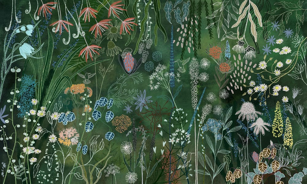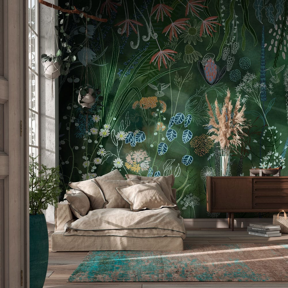 Immerse your space in the enchanting allure of the Lush Garden Whimsy Mural Wallpaper, where intricate botanical illustrations dance across a rich green canvas. Delicate flowers and foliage, detailed in soft corals, blues, and whites, create an artistic tapestry that exudes both vitality and elegance. This mural breathes life into any room, offering a sophisticated yet playful backdrop that suits a range of interior styles.