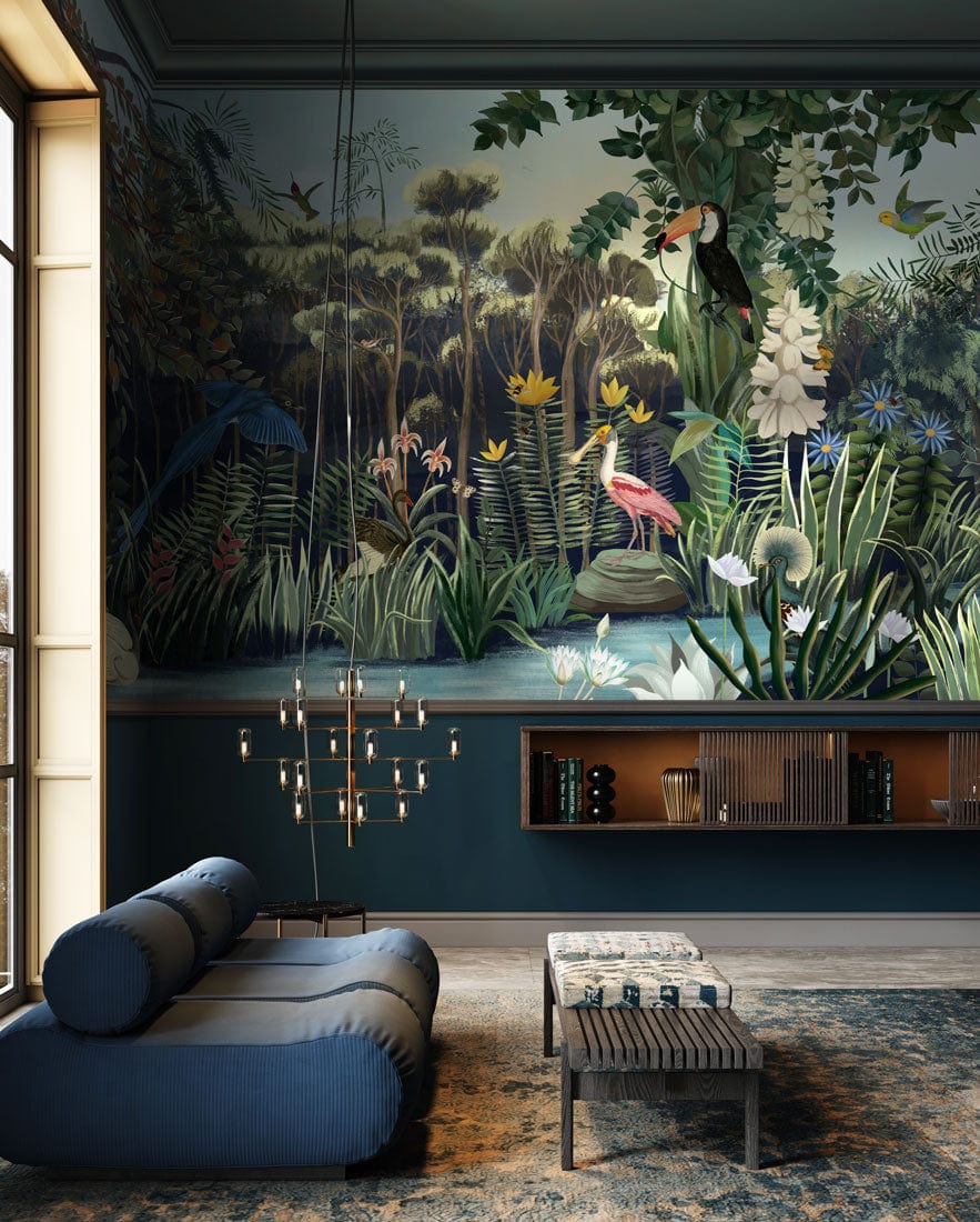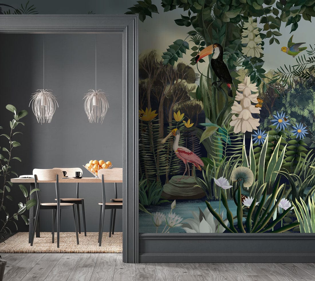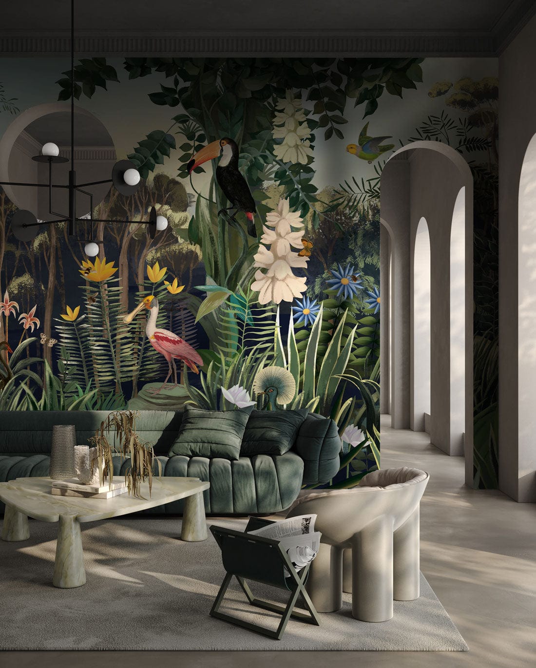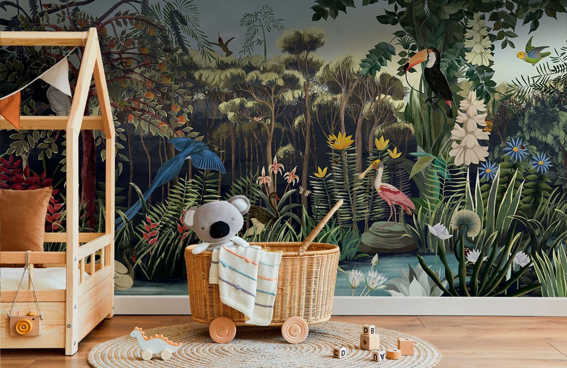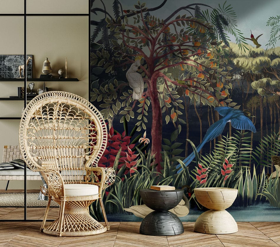 Immerse your space in the opulent allure of the Lush Tropical Jungle Wildlife Wallpaper. This exquisite design features a vivid tapestry of diverse flora and fauna, capturing the serene beauty of a thriving rainforest. Intricately detailed foliage and vibrant wildlife interplay amidst a backdrop that evokes a sense of depth and realism, making it a sophisticated addition to any room. The visual richness of this wallpaper is complemented by its tactile texture, offering an inviting touch of the exotic to your surroundings.