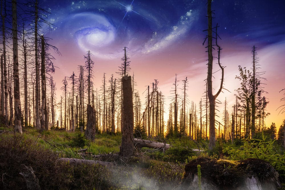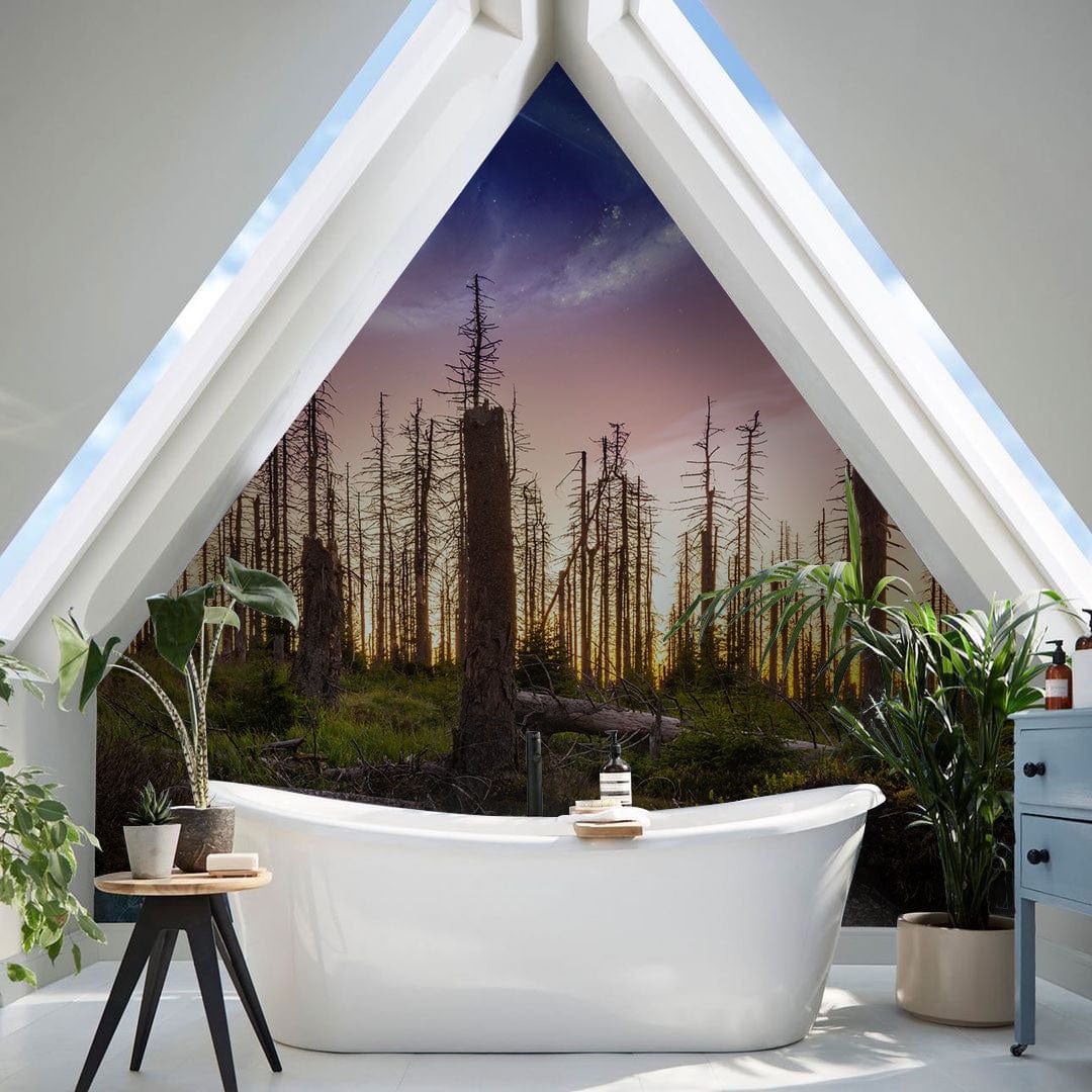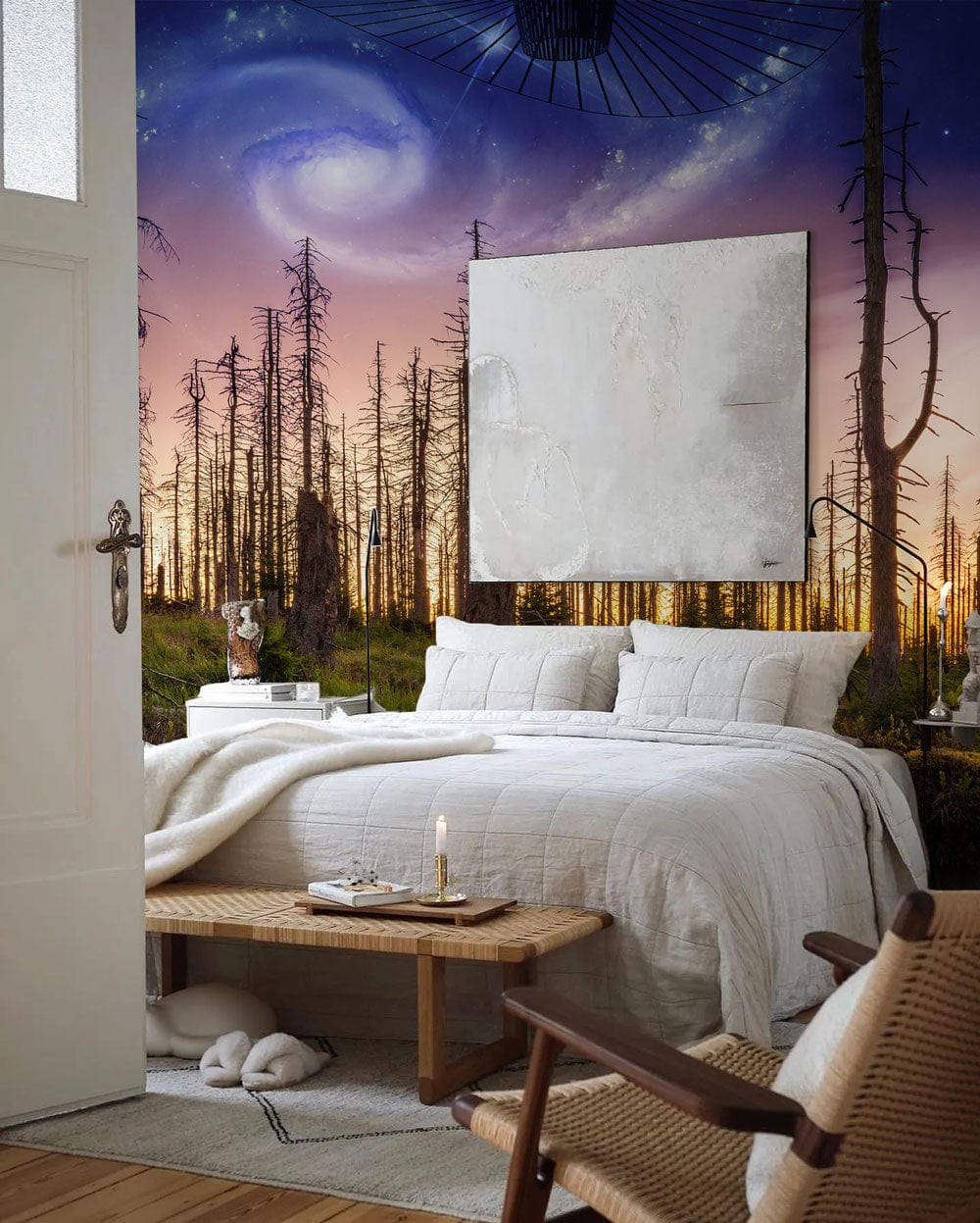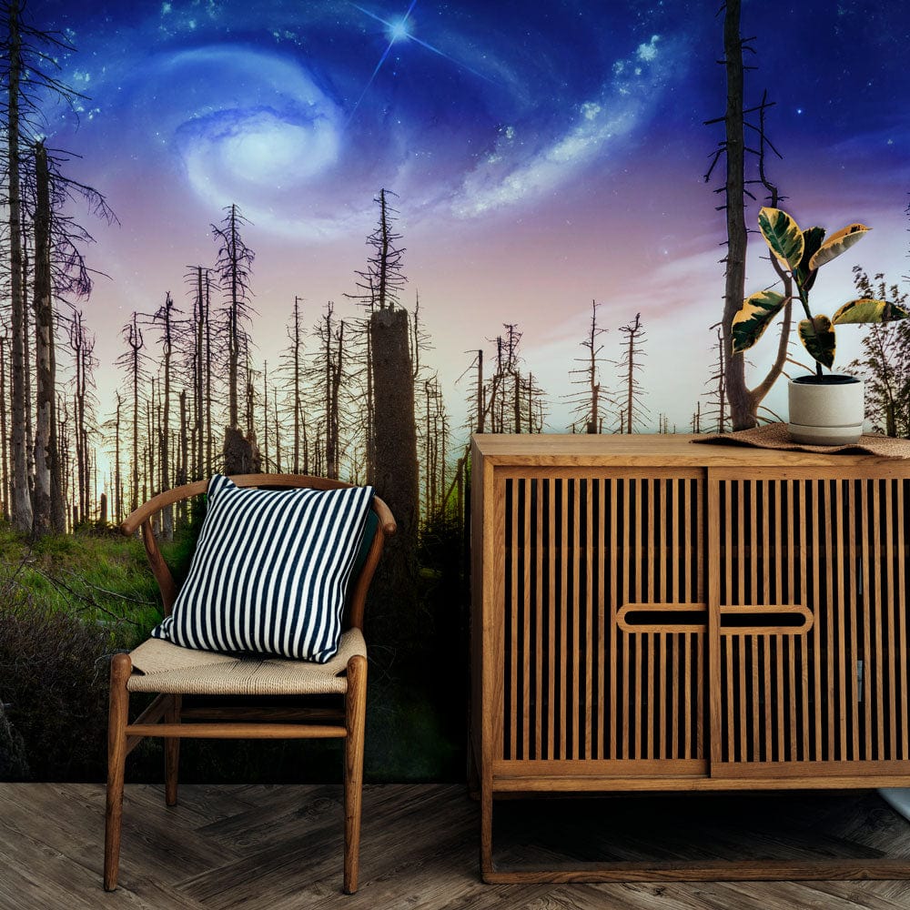 Immerse yourself in the mystical allure of the Magic Forest Wallpaper Mural, where towering silhouettes of trees stretch towards a twilight sky, splashed with swirls of cosmic wonder. This design captures the serene transition from dusk to evening, offering an ethereal backdrop that evokes both sophistication and timeless elegance. Perfect for creating a captivating focal point, the detailed artistry and rich textures invite a sense of calm and intrigue into your space, making it ideal for diverse interior settings.