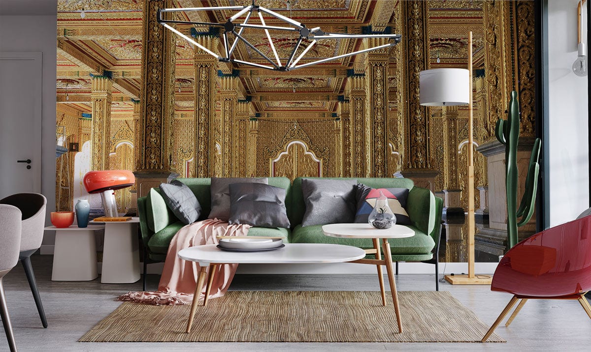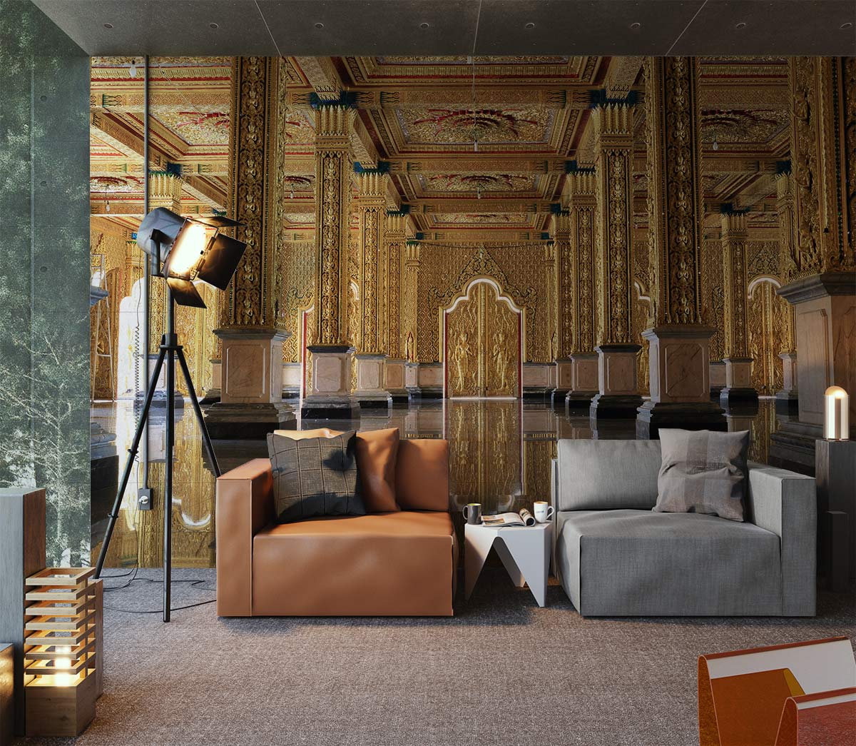 The Magnificent Palace Wallpaper Mural exudes opulence and grandeur with its intricate golden architectural motifs and ornate details. The mural captures the splendour of a regal palace, infusing any space with timeless elegance. Its rich gold and subtle earthy tones create a warm and luxurious ambience, perfect for those seeking a sophisticated aesthetic. This exquisite piece blends seamlessly into diverse interiors, whether showcasing the historical charm of vintage design or offering a focal point in a modern setting.