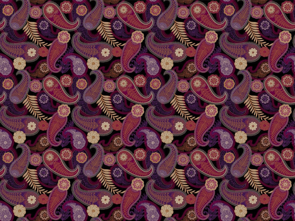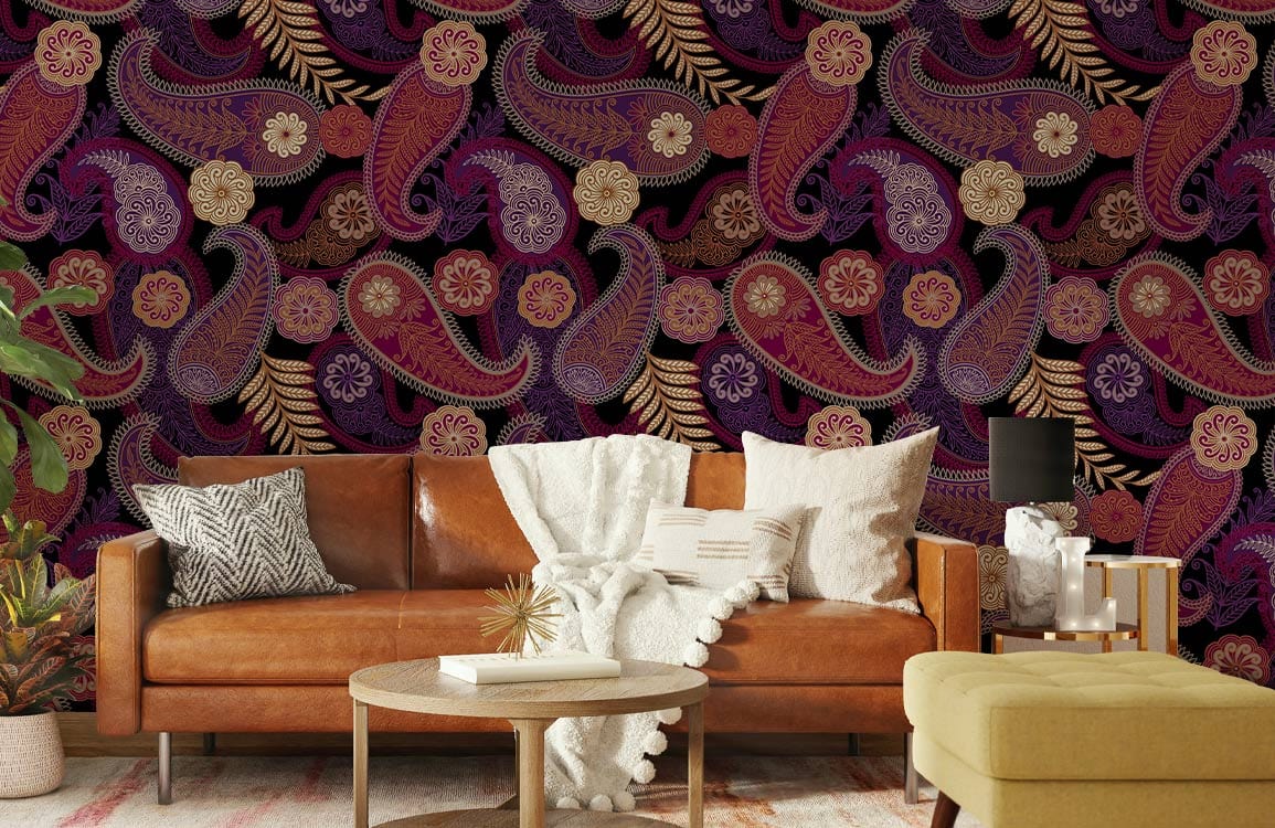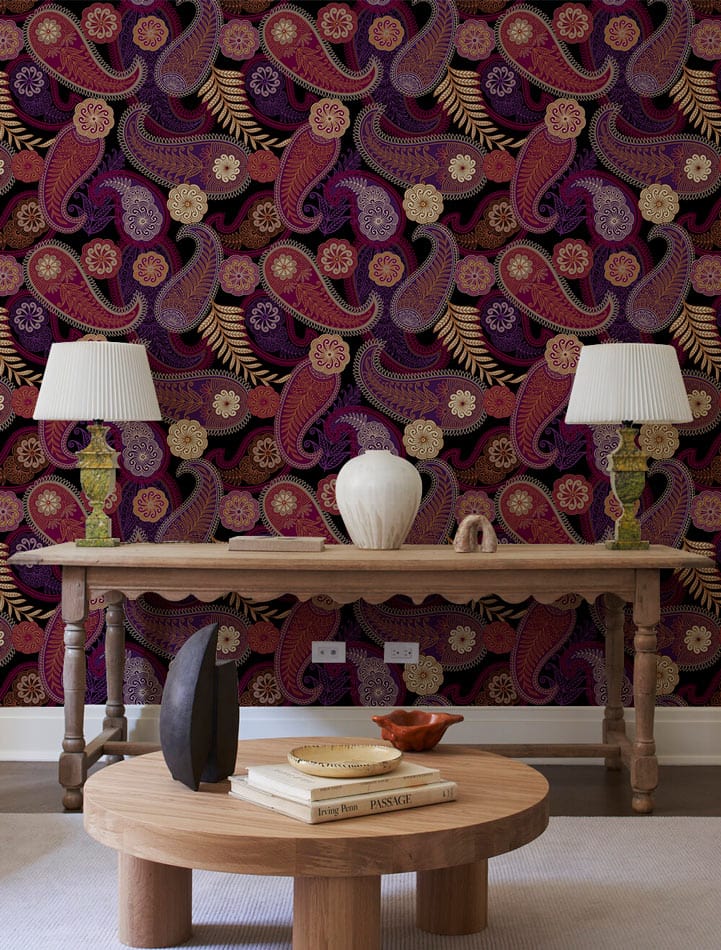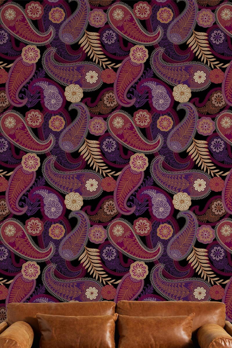 Immerse your space in the opulent intricacies of the Majestic Midnight Paisley Mural Wallpaper. This design marries rich burgundy, deep plum, and golden accents, forming a tapestry of elegant swirls and traditional paisley motifs. Its timeless charm and exquisite detail offer a sophisticated backdrop suitable for diverse settings.