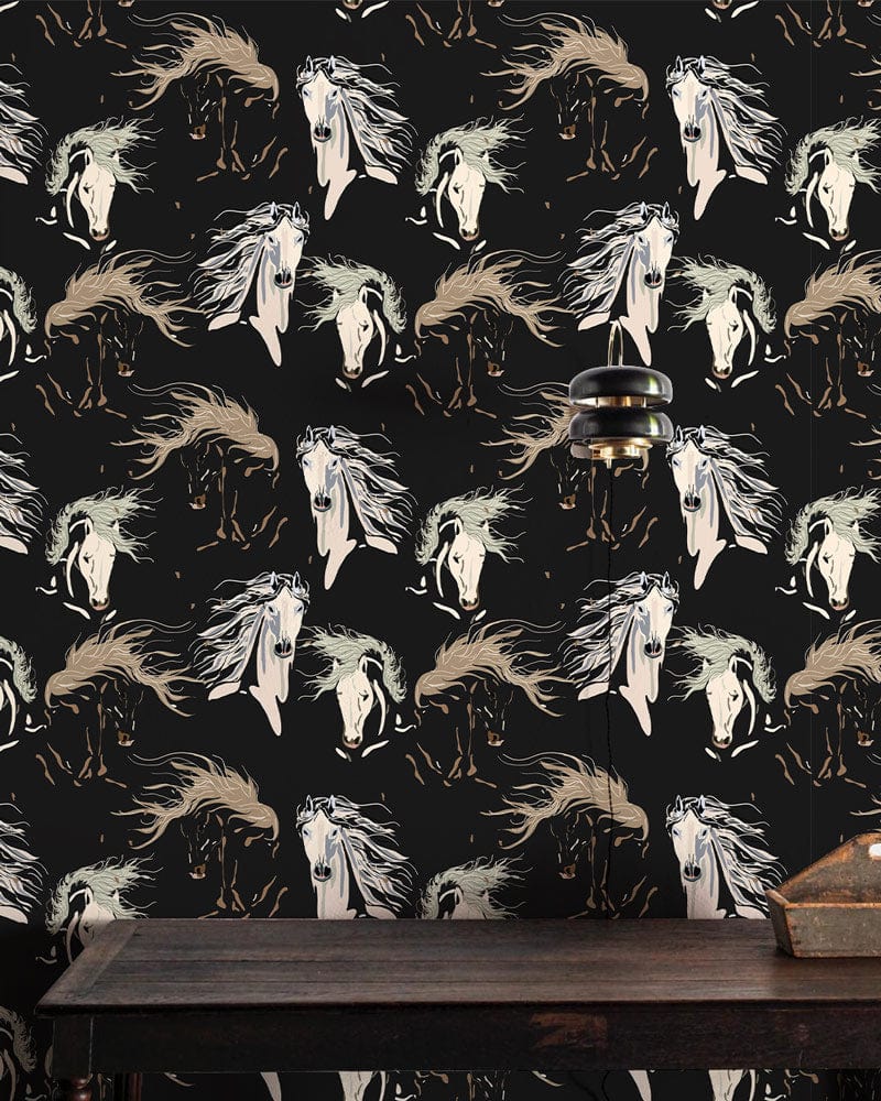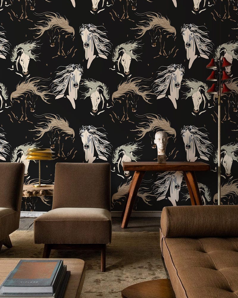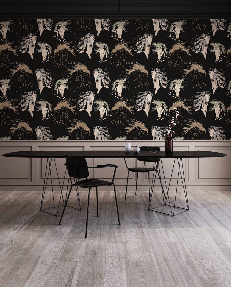 The Majestic Stallion Dance Mural Wallpaper captures the spirited movement of stallions, with intricately detailed illustrations that evoke a dynamic sense of motion. The dark and light interplay of hues against the backdrop creates a sophisticated and timeless charm, suitable for any stylish interior. Whether placed in a modern or a vintage setting, this wallpaper becomes a striking focal point, infusing spaces with its artistic allure and subtle textures.