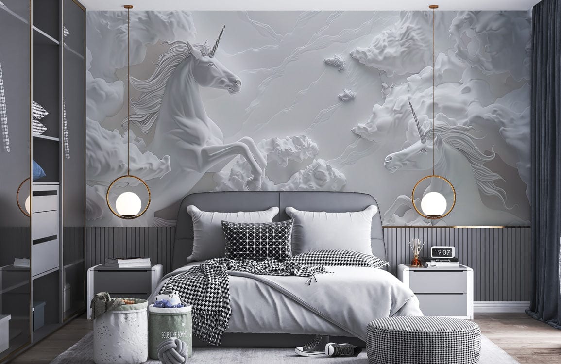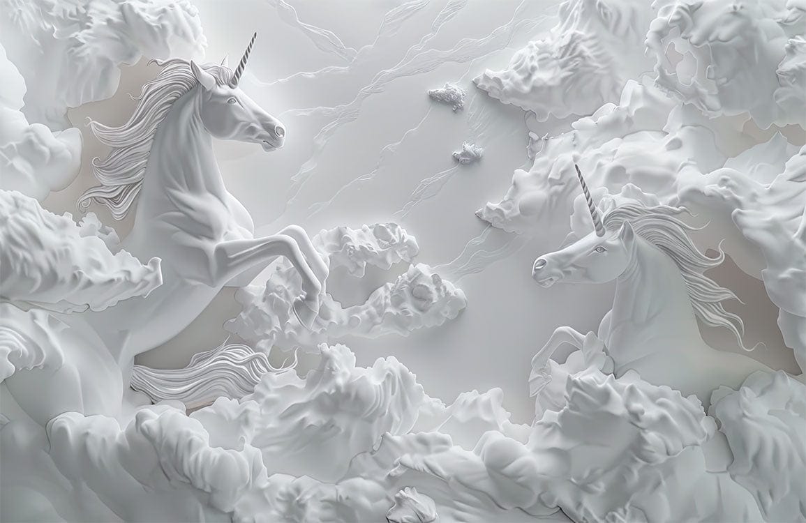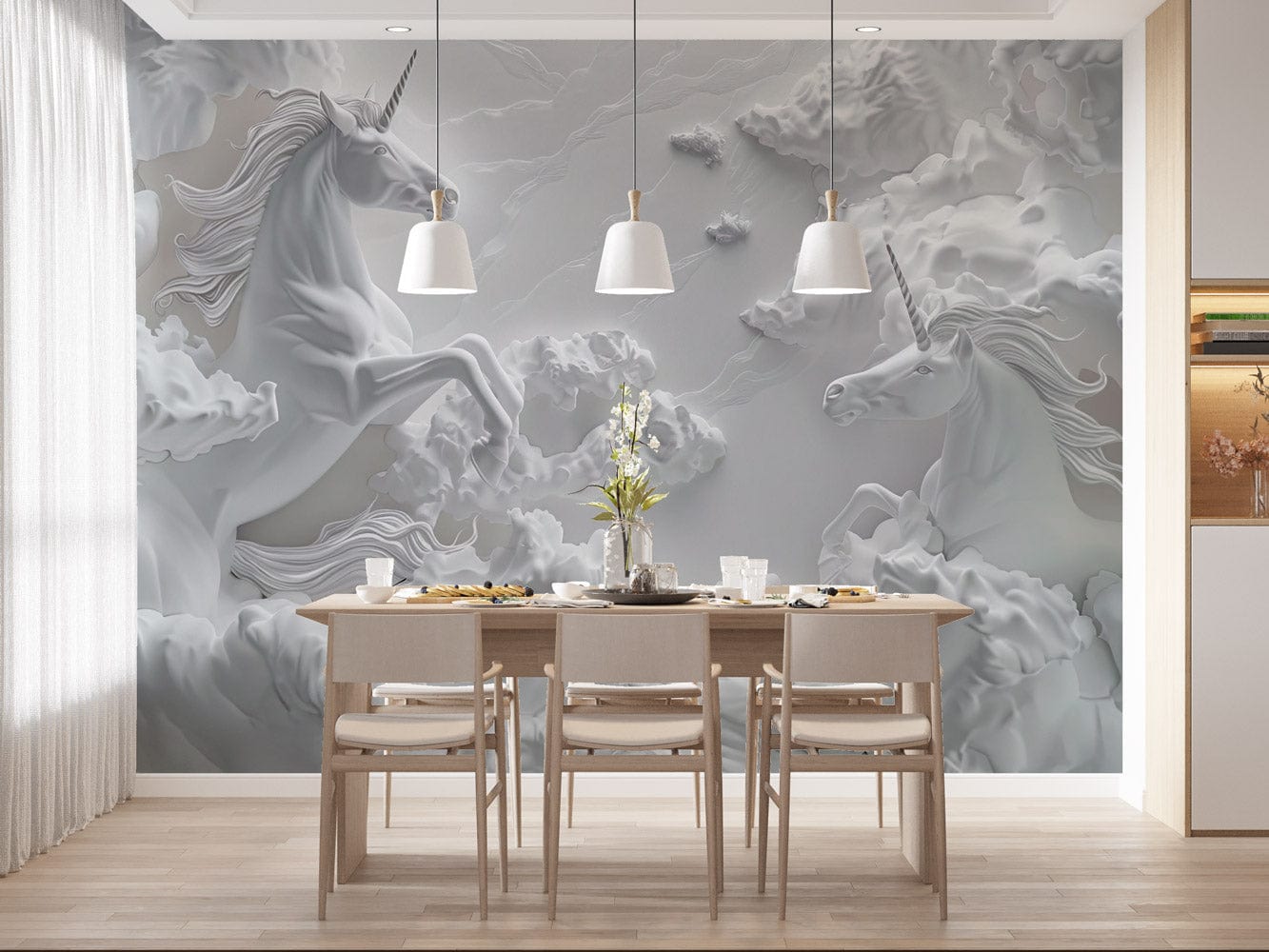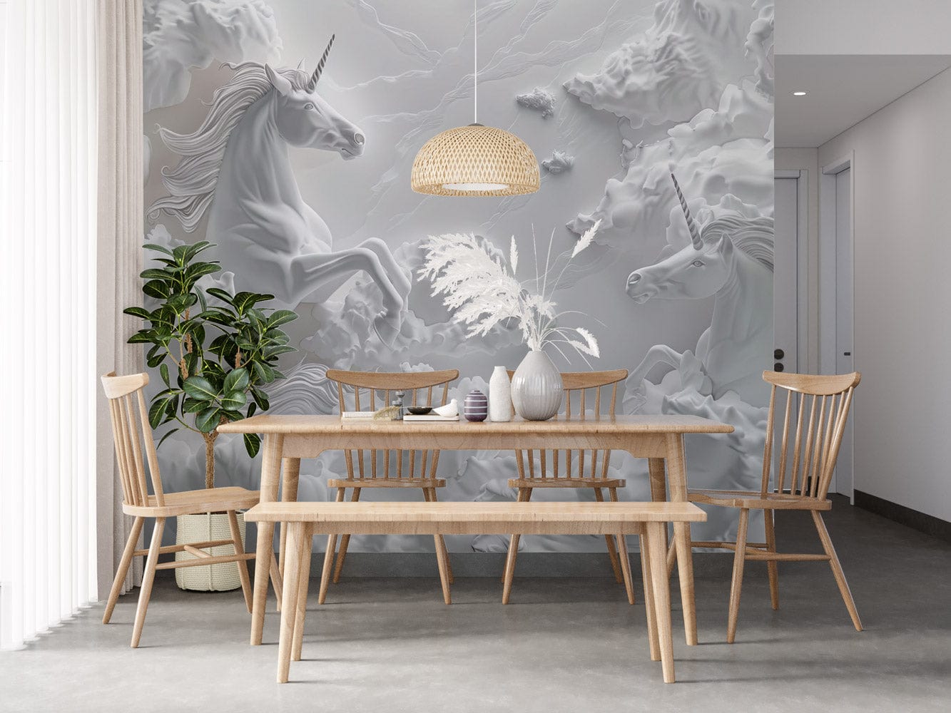 Majestic Unicorn Dreams Mural Wallpaper exudes a sense of enchantment and elegance, capturing the serene beauty of unicorns emerging majestically from ethereal clouds. The intricate detailing and soft textures conjure a dreamlike ambience, offering a touch of whimsy with its finely crafted design. Suitable for both classic and contemporary interiors, this mural invites a timeless allure into any room.