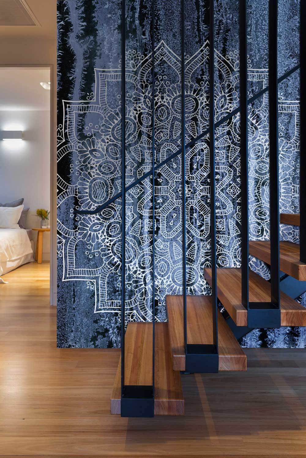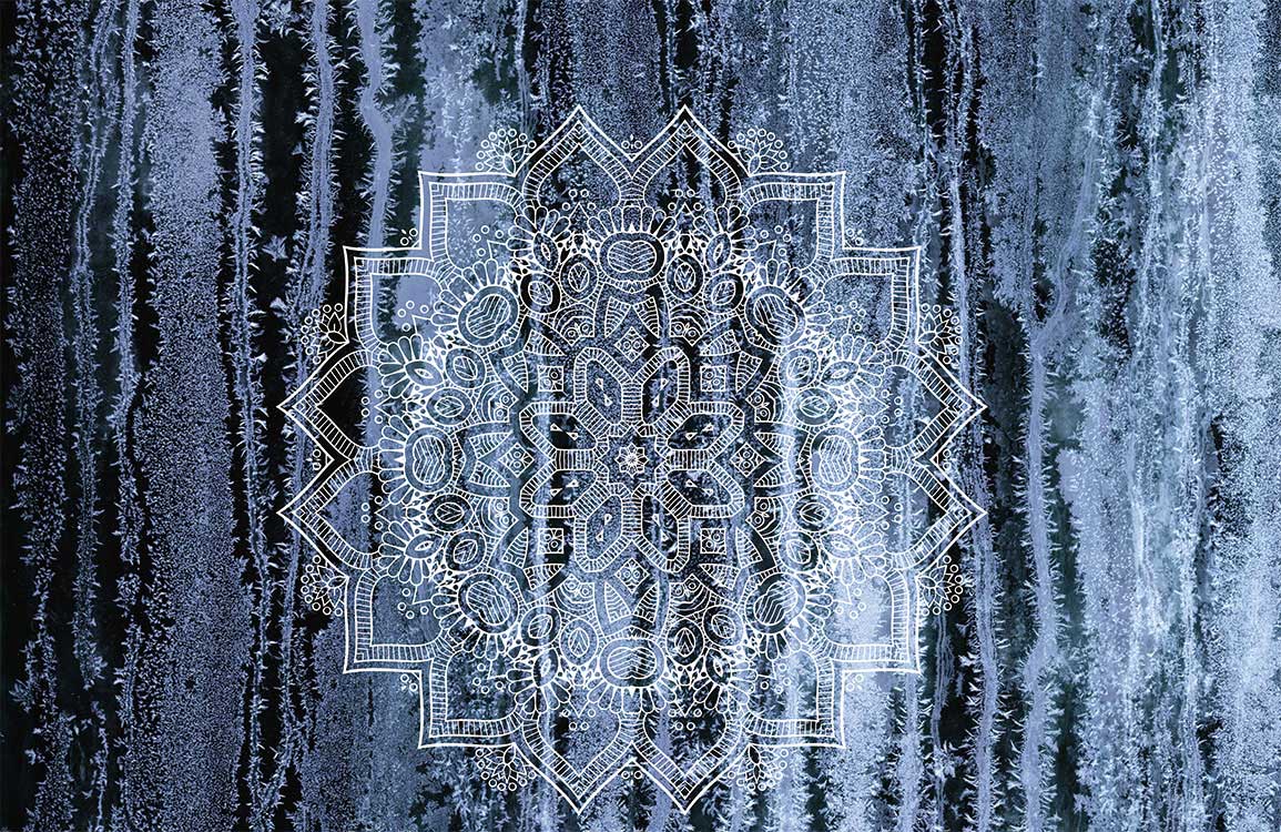 Indulge in the exquisite interplay of delicate mandala patterns set against an abstract backdrop of ice crystals, rendering a scene that whispers serenity and elegance. This mural's intricate geometry and sophisticated textures invite an aura of tranquillity, making it a distinguished choice for both contemporary and classic settings.
