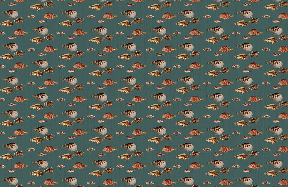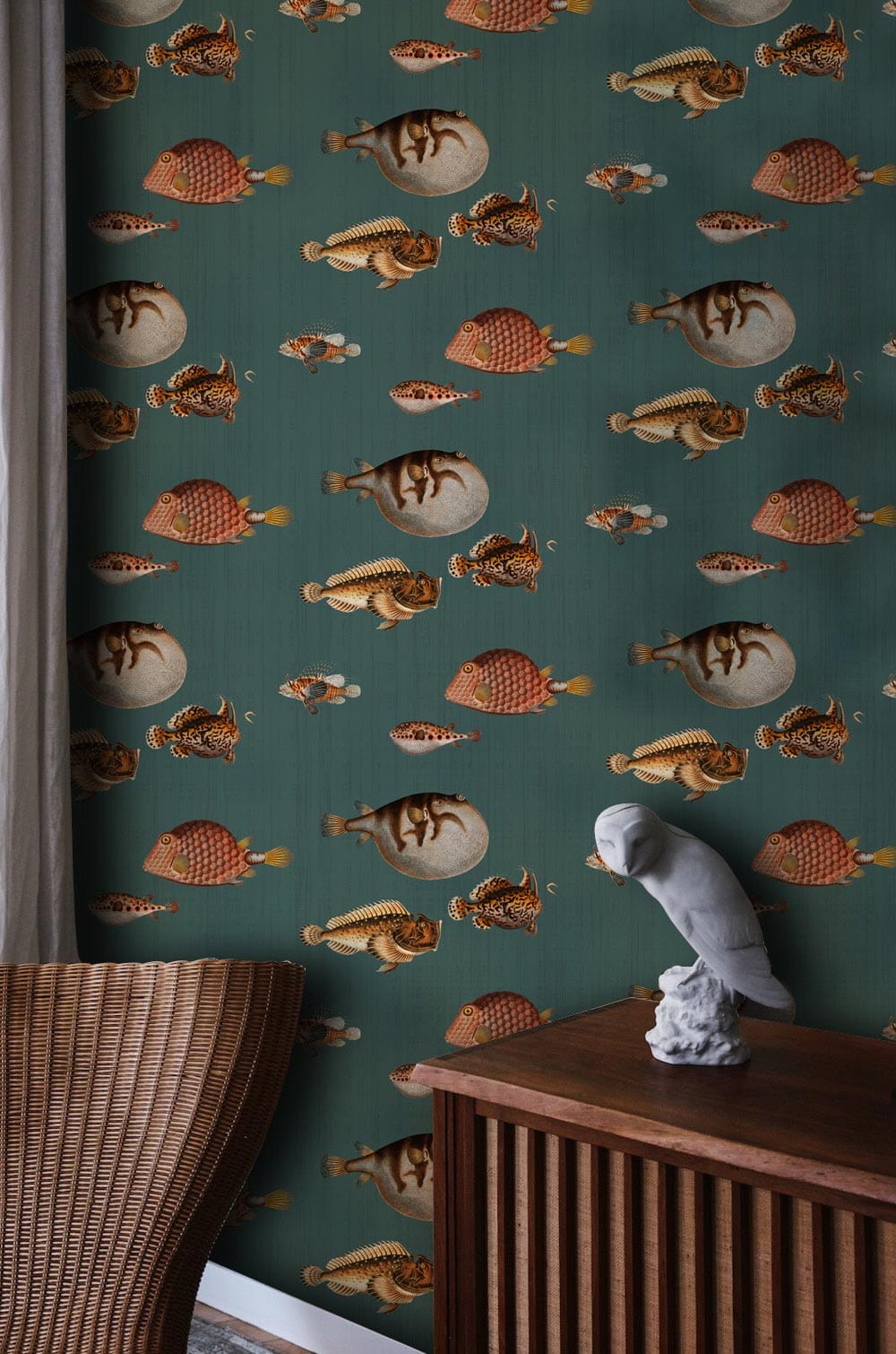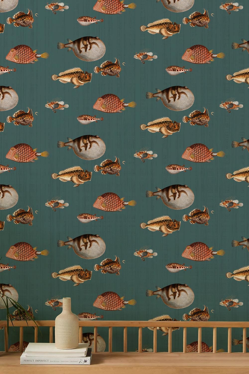 Immerse yourself in the enchanting depths of the ocean with this Marine Fishes Wallpaper Mural. Featuring an exquisite pattern of vintage marine life, each fish is meticulously illustrated, capturing the whimsical beauty and diversity of underwater habitats. The rich emerald backdrop accentuates the intricate details and warm tones of the aquatic creatures, creating a tapestry that evokes a serene and timeless ambience. Perfect for adding a touch of natural elegance and sophistication to any setting.