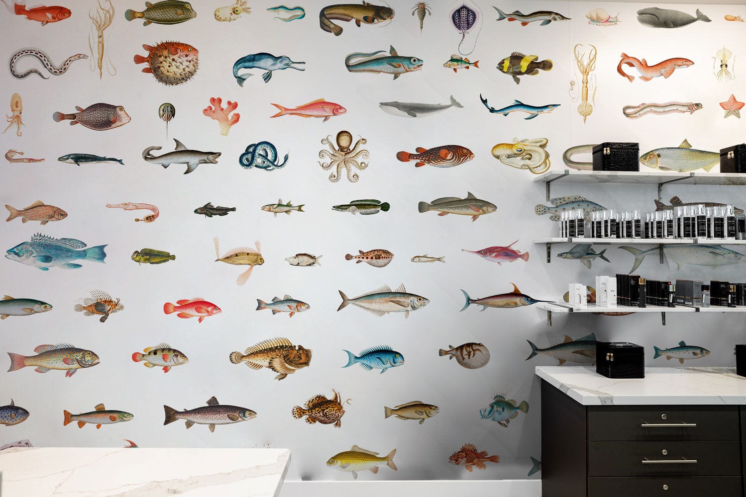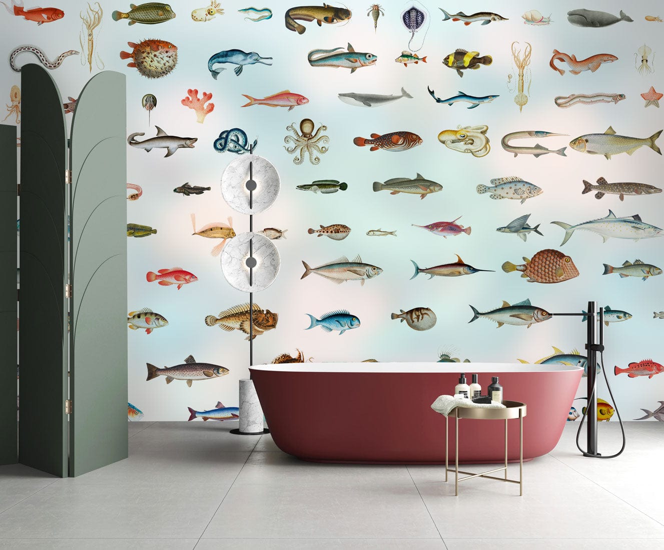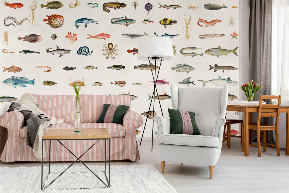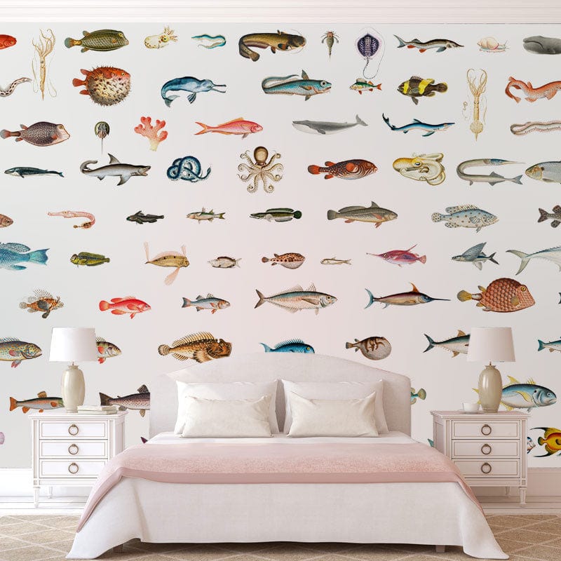 Dive into an oceanic masterpiece with the Marine Fishes Wallpaper Mural, where aquatic elegance is portrayed in exquisite detail. This mural combines artistic renderings of diverse marine life against a subtle off-white background, offering an enchanting underwater tableau. Its intricate designs capture the fluid grace of the sea's inhabitants, bringing a tranquil yet vibrant ambience to any interior. The refined illustrations are both sophisticated and timeless, making this piece suitable for an array of spaces, whether adding depth to a living room or serenity to a bedroom.