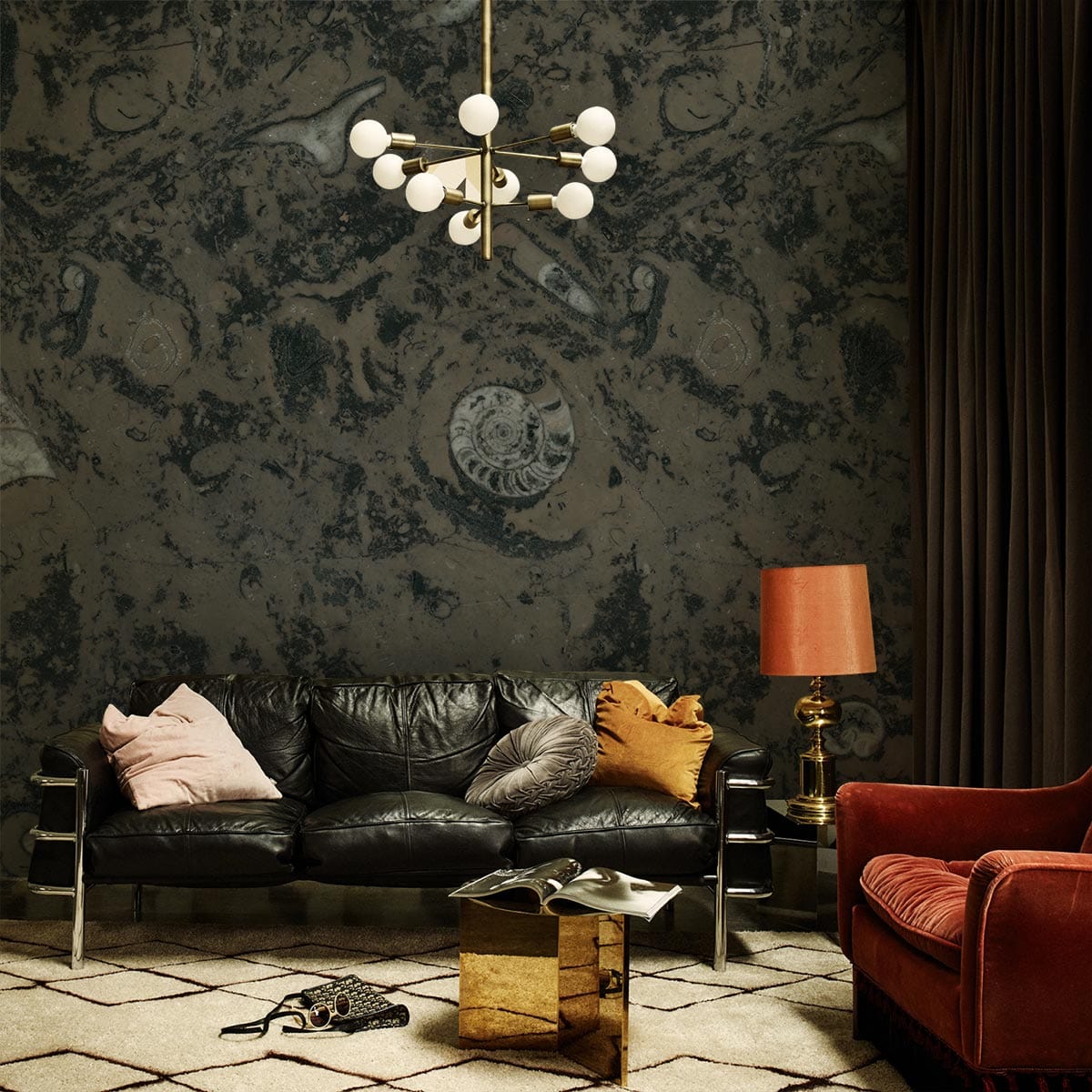 Rock out your room with this unique wallpaper! Mesmerizing marine fossil stones shimmer in their natural seafoam green tones and are set against a clean black gravel background that would compliment a variety of decors. The stone mosaic design will add depth and character to any surface, creating a dynamic look that pairs well with a wide range of decor styles. From the newly renovated to transformed spaces, this marbled look will give your home a sophisticated and modern feel in your home.