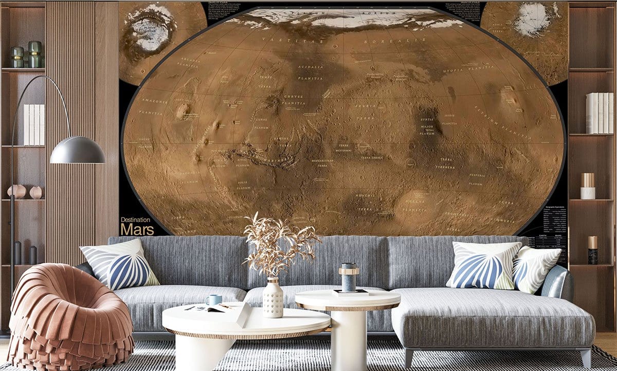 Get to know more about the Mars with our made-to-order map wallpaper mural.This map wall mural is ideal for adding a splash of colour to any place in your bedroom or home office. Works well with modern style furniture of your choice.