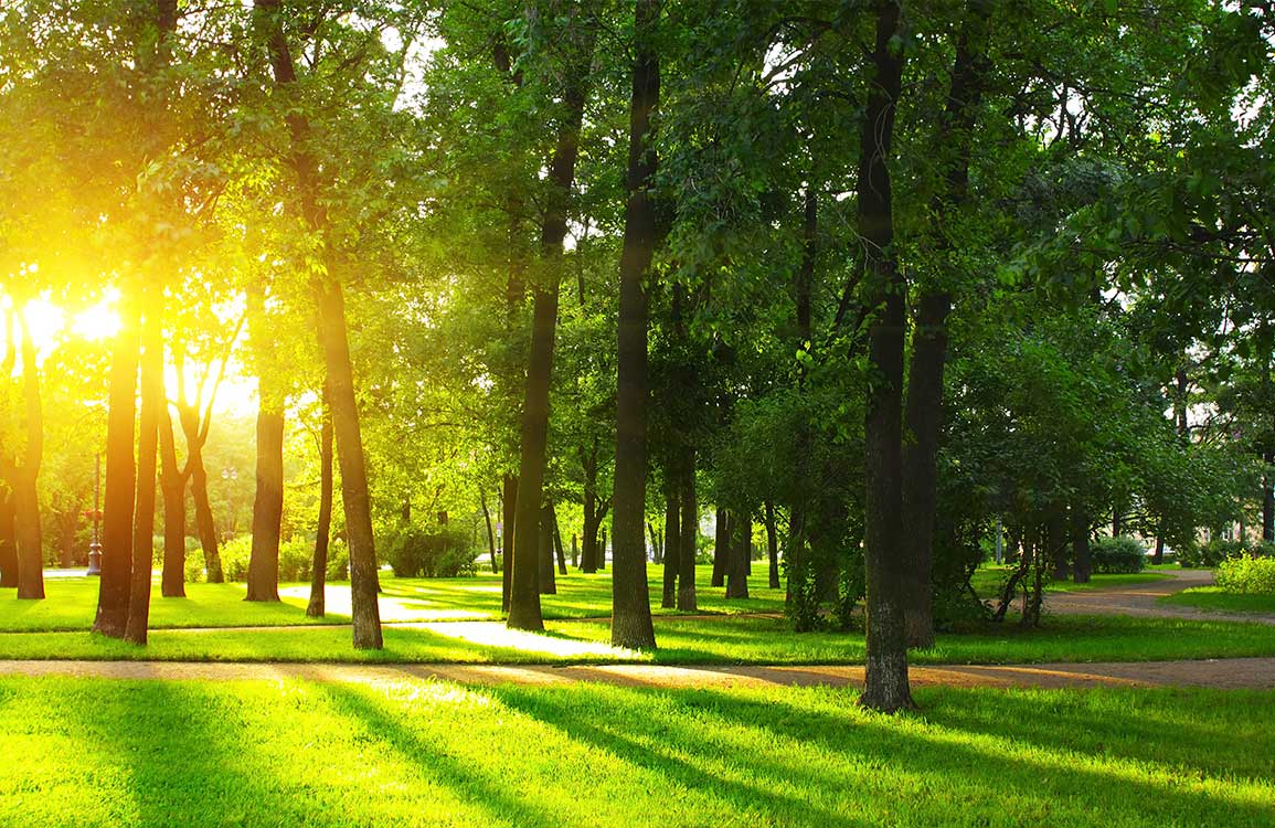 Immerse your space in the tranquil charm of the Matinal Park Wallpaper Mural. This picturesque design captures the tender glow of morning sunlight filtering through a lush canopy of trees, casting gentle shadows on the vibrant green lawn. Its detailed artistry and serene ambience create a seamless connection with nature, making it an exquisite choice for refined interiors.