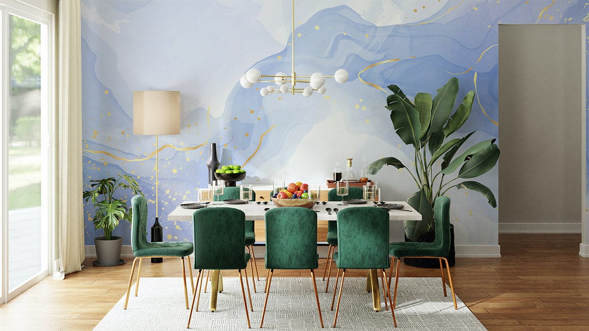 The Melting Blue Watercolour Wallpaper Mural mesmerises with its fluid, ethereal design. Delicate waves of blue cascade seamlessly across your wall, infused with subtle golden flecks that evoke a sense of serene luxury. This mural marries artful fluidity with sophisticated textures, making it a timeless addition to both contemporary and classic interiors. Its gently flowing forms and soft gradients create a captivating focal point, inviting a breath of tranquillity and elegance into your space.