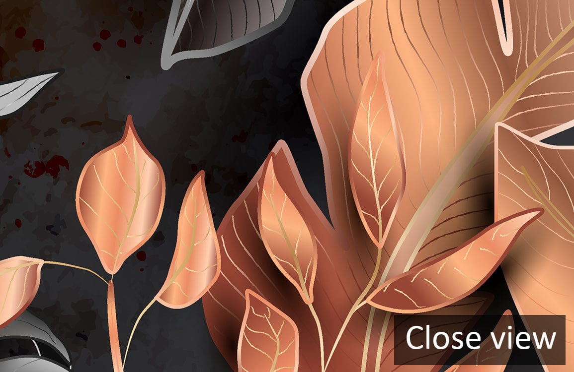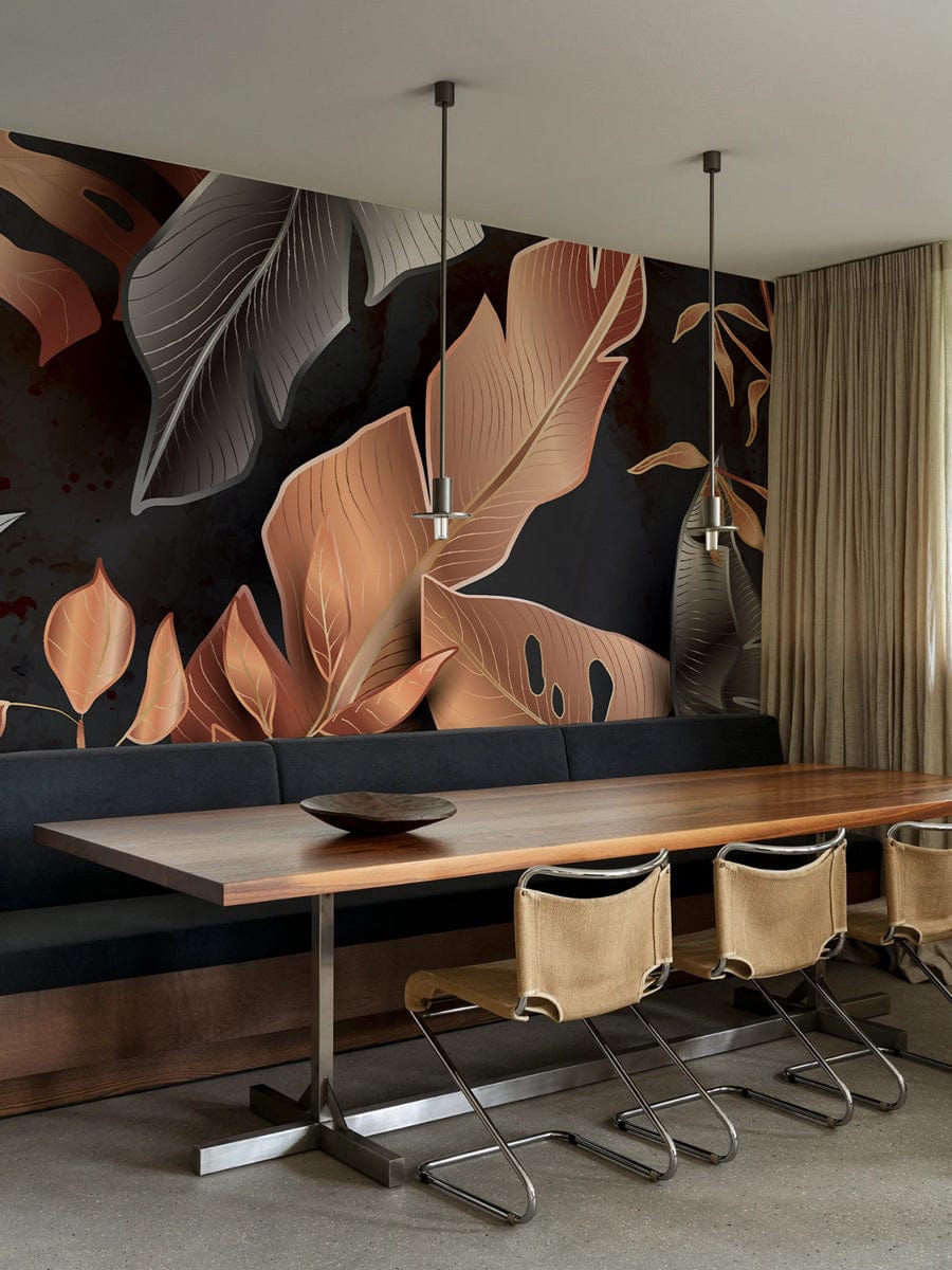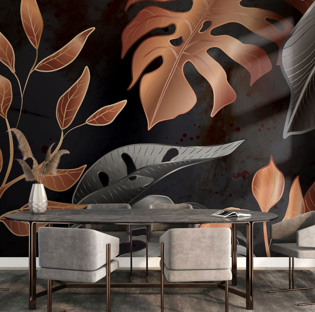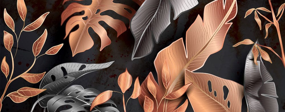 Embrace a vivid tapestry of nature with the Metallic Tropical Harmony Mural Wallpaper. Rich, metallic motifs of lush foliage entwine across a deep, luxurious backdrop, creating a striking visual interplay. The intricate detailing of leaves, each delicately shaded, brings a touch of the exotic into any interior space, enveloping the room in warmth and elegance. Its artful composition invites sophistication and timeless charm, effortlessly complementing both contemporary and traditional settings.